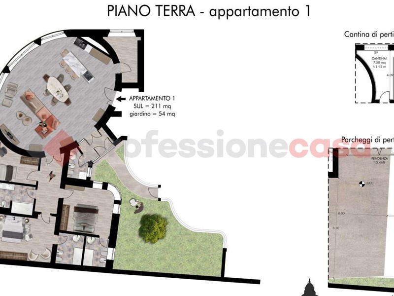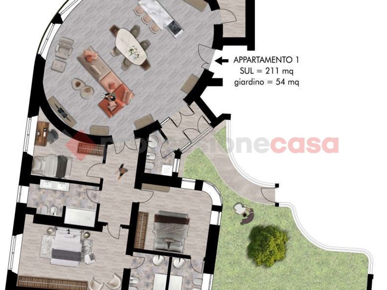L'appartamento n.1 colpisce innanzitutto per l'abbondanza degli spazi con i suoi 211mq lordi, un giardino esclusivo di circa 50 mq, cantina e 2 posti auto.