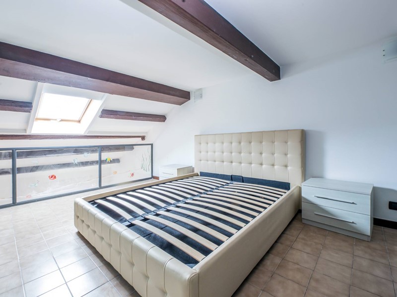 Dal lato opposto la camera da letto matrimoniale e al centro della sala la bellissima scala in legno, molto comoda con ampi scalini che conduce al piano superiore in cui troviamo la seconda camera da letto, un bagno in camera e un disimpegno molto caratteristico che può essere utilizzato ad esempio come cabina armadi.