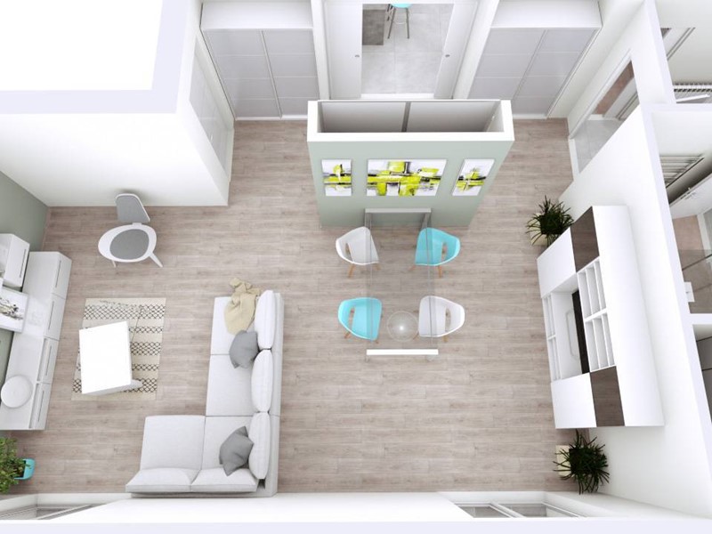 Cucina/soggiorno molto luminosa, con grandi finestre