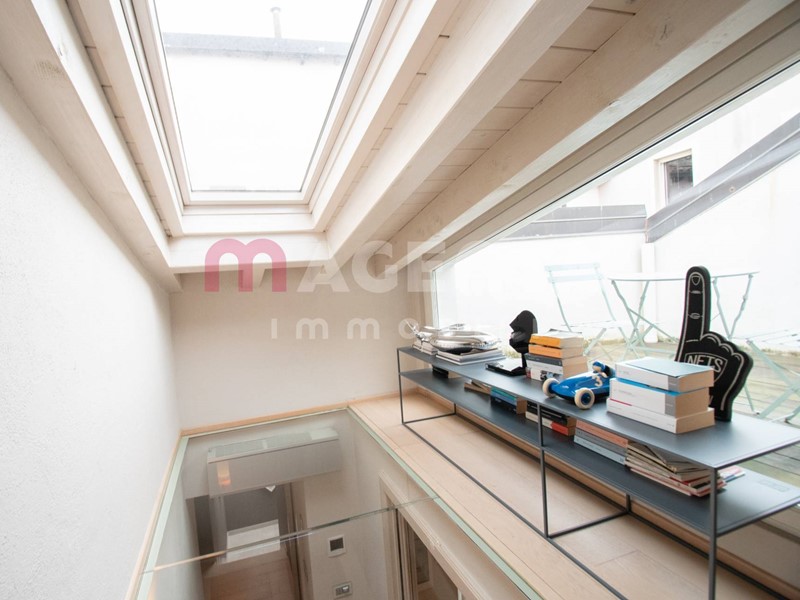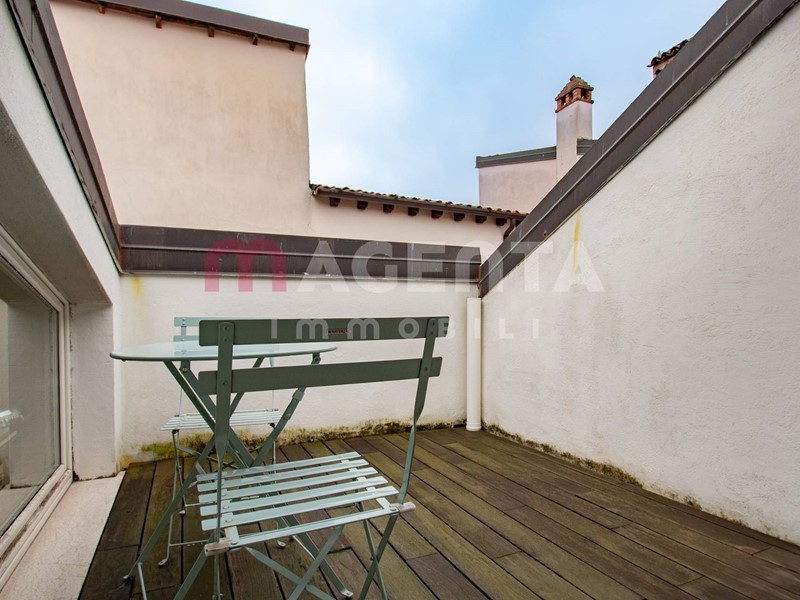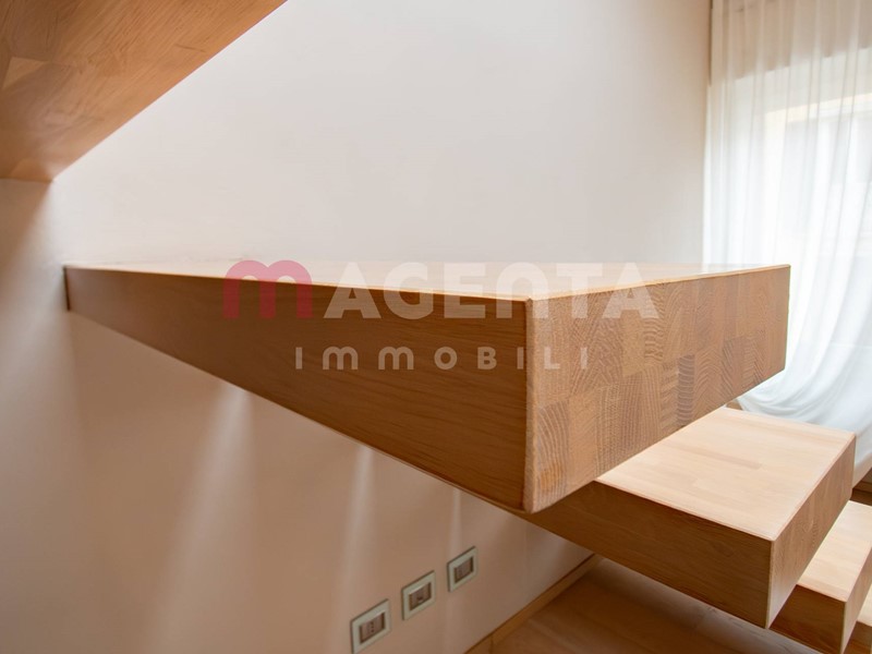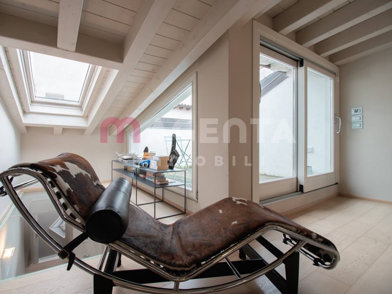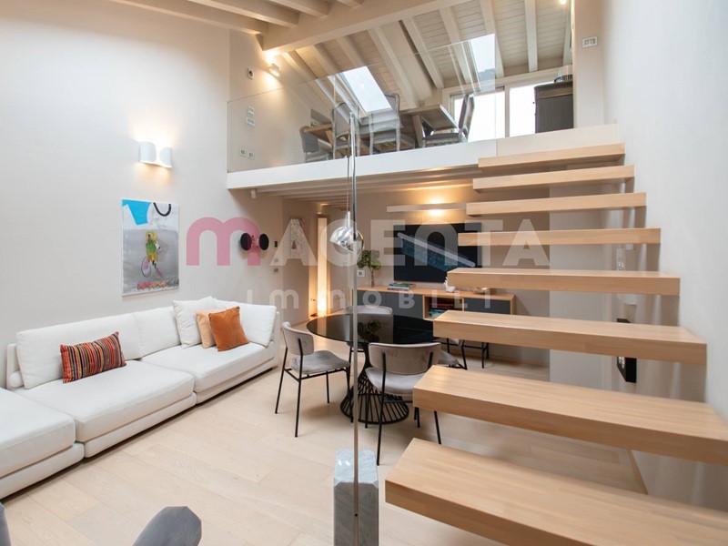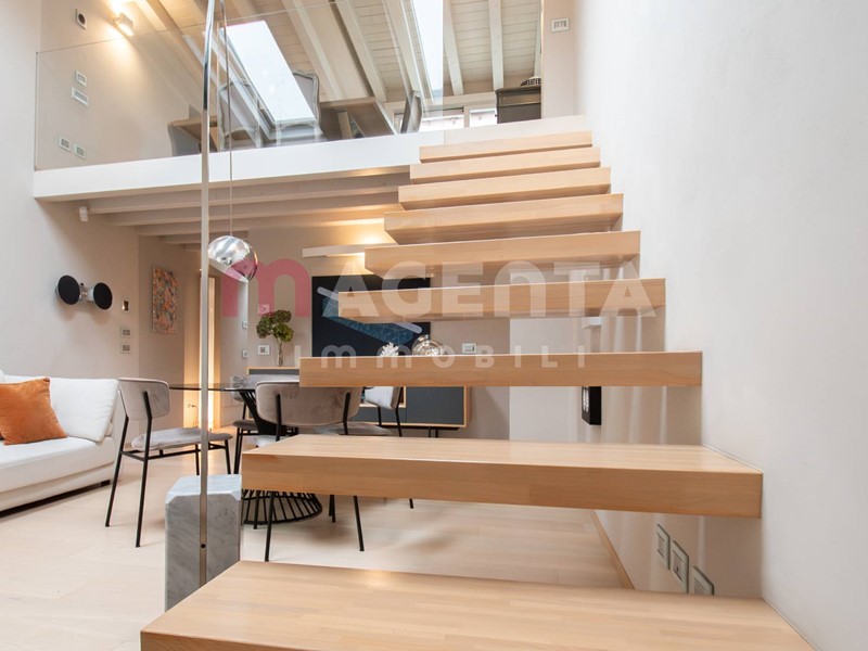 Una moderna scala di design conduce al soppalco, che ospita un gradevole spazio relax e si apre su un delizioso terrazzo, ideale per momenti di tranquillità allaria aperta.