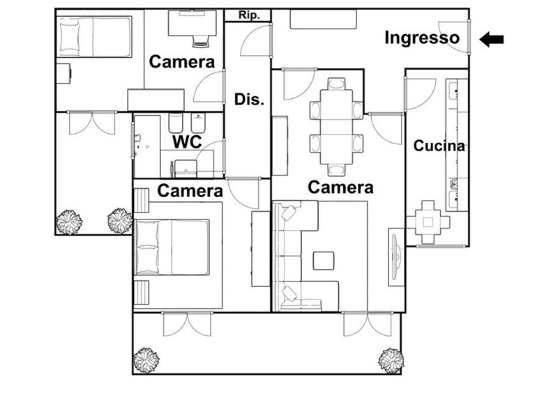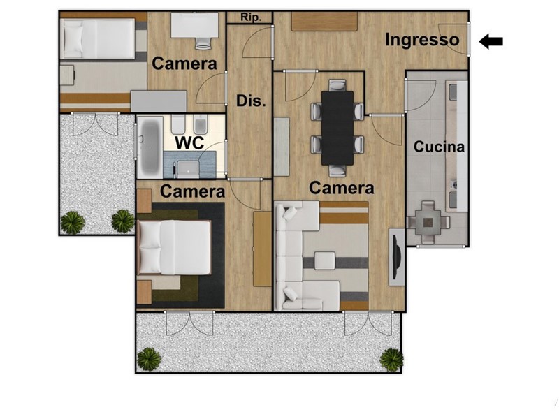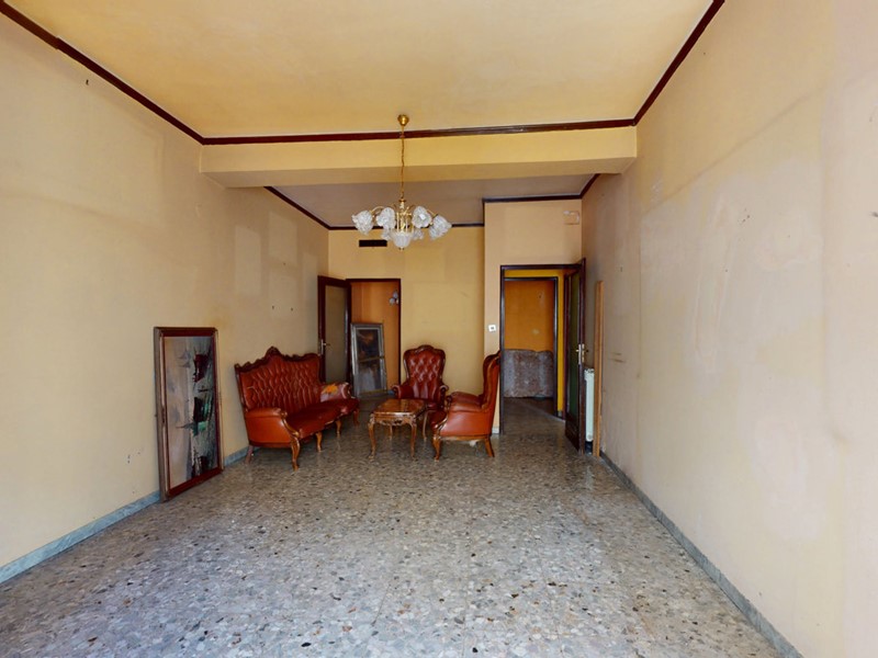 La distribuzione interna prevede soggiorno con doppio ingresso, due camere da letto, cucina abitabile e un bagno. L'immobile è da rimodernare, offrendo la possibilità di personalizzare gli ambienti secondo i propri gusti, ottimizzando al meglio i 96 mq interni oggi organizzati secondo una ristrutturazione datata.