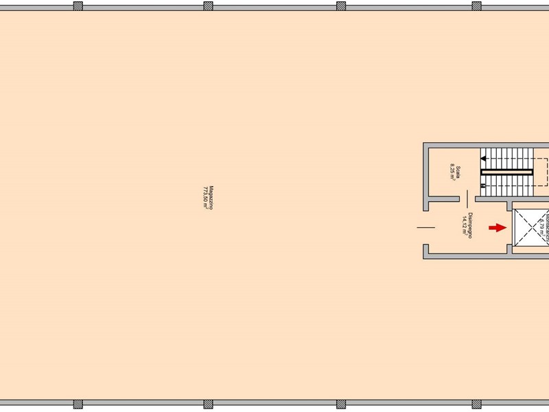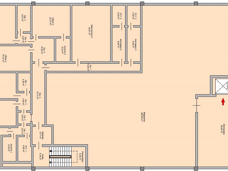 Limmobile è situato al primo piano di un fabbricato industriale sviluppato su due livelli, con accesso dal piano terra tramite scale interne e montacarichi, oltre a spazi riservati al carico e scarico merci.