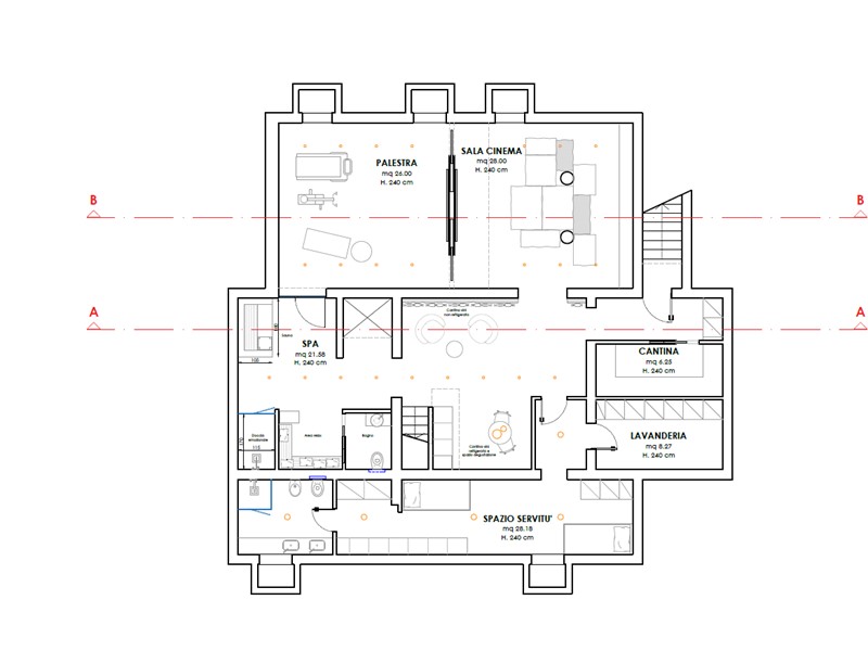 Ampio e luminoso interrato dove poter realizzare un piccolo appartamento di servizio composto da camera e bagno oltre a lavanderia, spa, palestra e cantina.