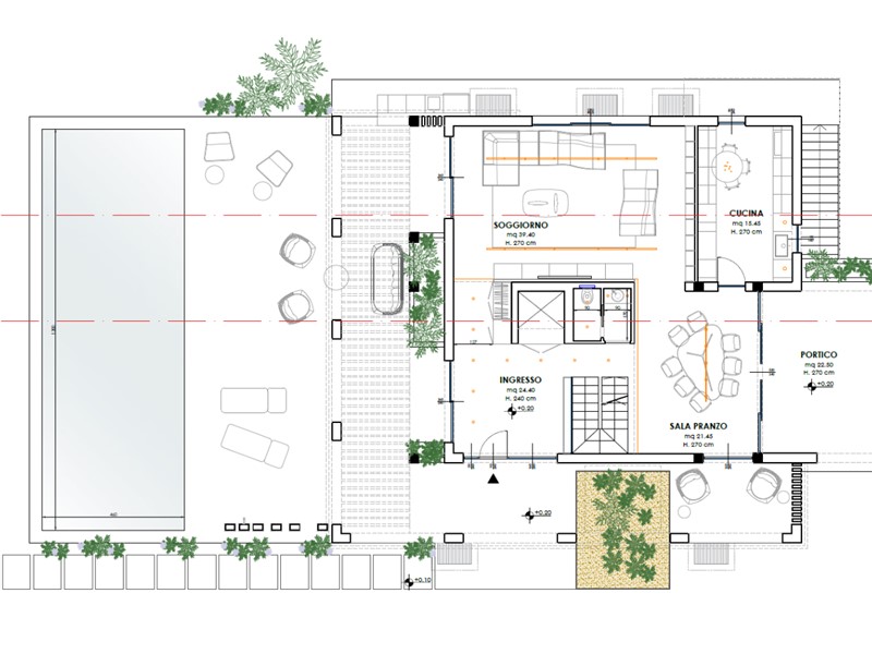 Al piano terra ingresso, ampio salone, sala da pranzo, cucina abitabile, bagno di servizio e portico per il pranzo all'aperto.