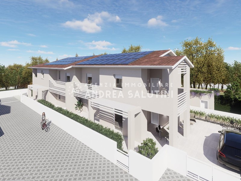 Composto da ampia zona giorno di circa 45 m2 suddivisa tra cucina abitabile e soggiorno, disimpegno notte, camera matrimoniale, camera doppia e camera singola, doppi servizi e ripostiglio. Completano la proprietà due posti auto privati in corte comune, loggiato di 16 m2 e giardino di circa 70 m2. Capitolato di alta qualità, tra le caratteristiche principali troviamo: riscaldamento a pavimento con pompa di calore, pannelli fotovoltaici 6kw, infissi in legno, tapparelle orientabili e motorizzate. È inoltre predisposto per l'impianto d'allarme, l'impianto addolcitore acqua e l'impianto di climatizzazione. Possibilità di personalizzazione degli interni.
