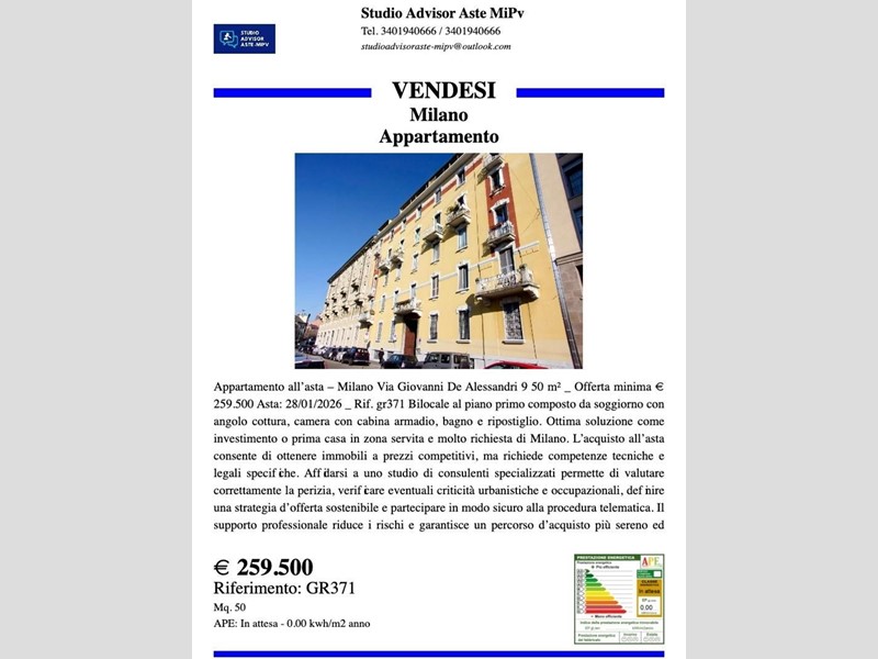 Questo annuncio è stato redatto da Studio Advisor Aste MiPv sulla base della documentazione ufficiale di vendita. Le informazioni qui riportate non sostituiscono la pubblicità legale e potrebbero contenere imprecisioni o variazioni rispetto agli atti ufficiali. Studio Advisor Aste MiPv declina ogni responsabilità per errori, omissioni o modifiche intervenute successivamente alla pubblicazione.