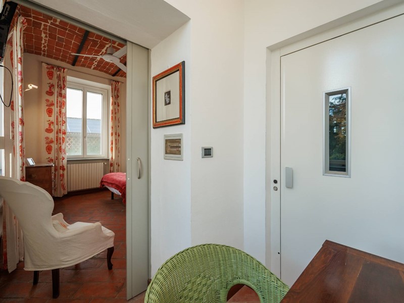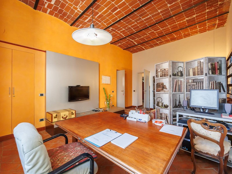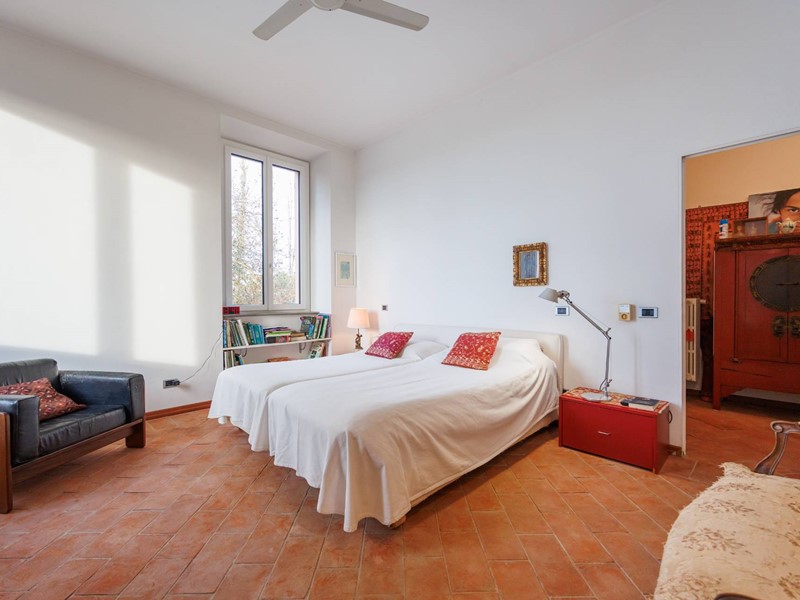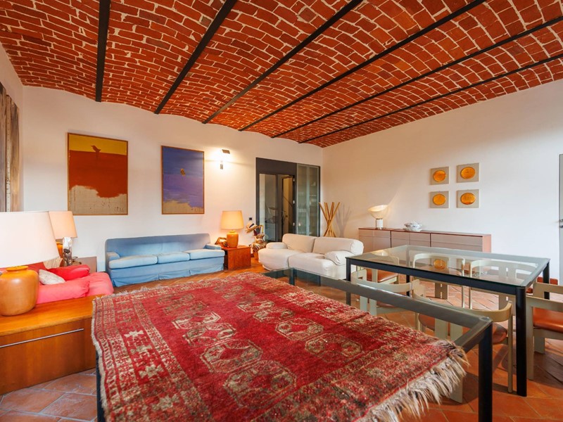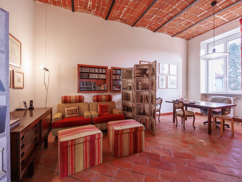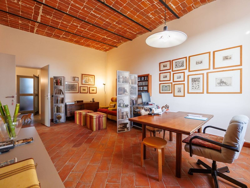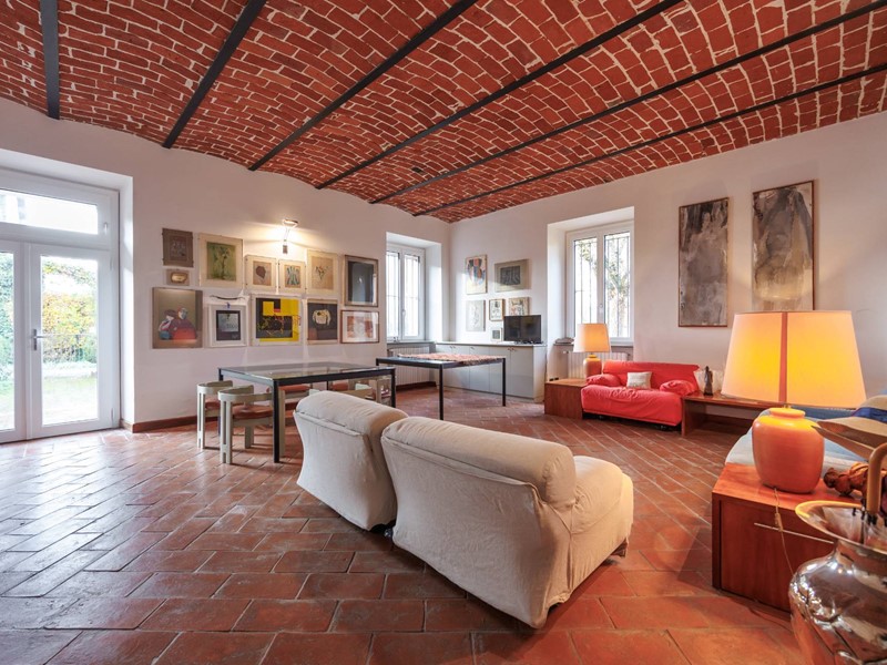 Labitazione, disposta su ampi volumi e caratterizzata da soffitti alti in mattone e affacci sul parco, è composta da ingresso, tre salotti con camino, una cucina abitabile, cinque camere da letto, uno studio soppalcato, cinque bagni, una cantina e lavanderia.