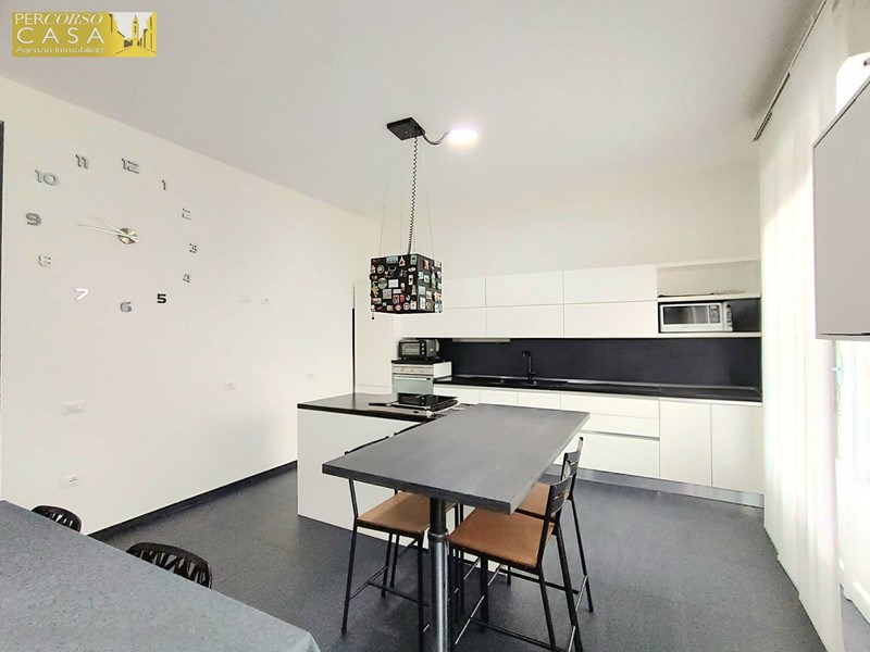 ingresso, ampio soggiorno open space con cucina a vista, disimpegno, due bagni (di cui uno in camera) entrambi con box doccia, ripostiglio adibito a zona lavanderia e due balconi.