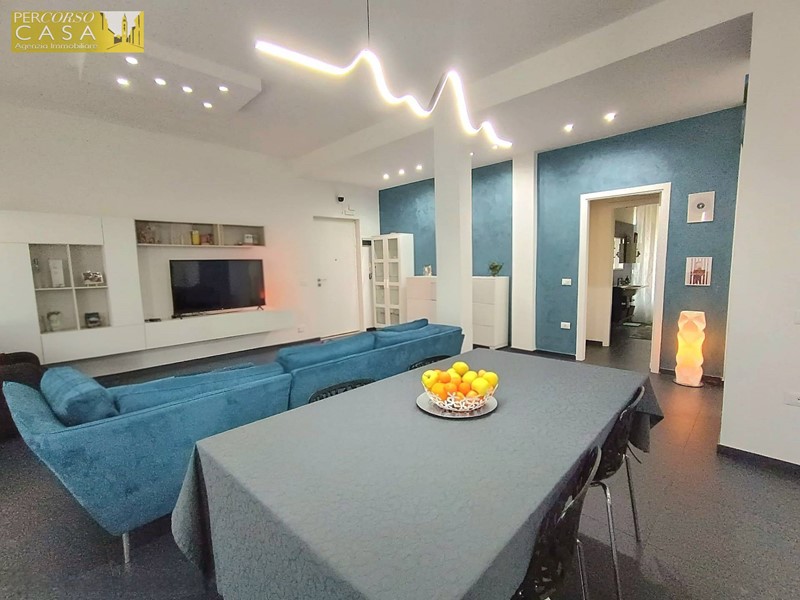 Controsoffitti in cartongesso con faretti, pavimentazione in gres porcellanato, bagni con sanitari filo muro, portone blindato, infissi in legno con doppi vetri e tapparelle in legno, riscaldamento autonomo con termosifoni in ghisa, condizionatori, porta d'ingresso blindata. L'appartamento è stato ritinteggiato ad ottobre 2025.