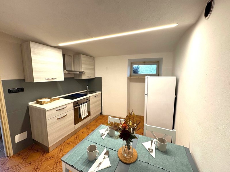 L'ingresso conduce a una cucina abitabile con angolo cottura moderno, dotato di piano a induzione.