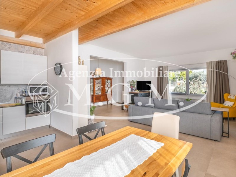 L'ingresso si apre su un grande open-space di 45 mq, dove la zona living – con grandi vetrate affacciate sul verde – e la zona pranzo dialogano con una cucina moderna e funzionale, separata ma in continuità visiva, arricchita da travi a vista che donano calore. Ogni dettaglio parla di comfort: un bagno finestrato con doccia, una pratica lavanderia/ripostiglio e uno spazio di servizio ben organizzato.