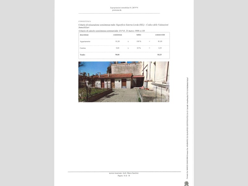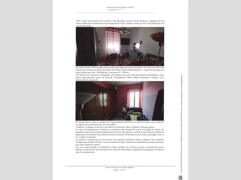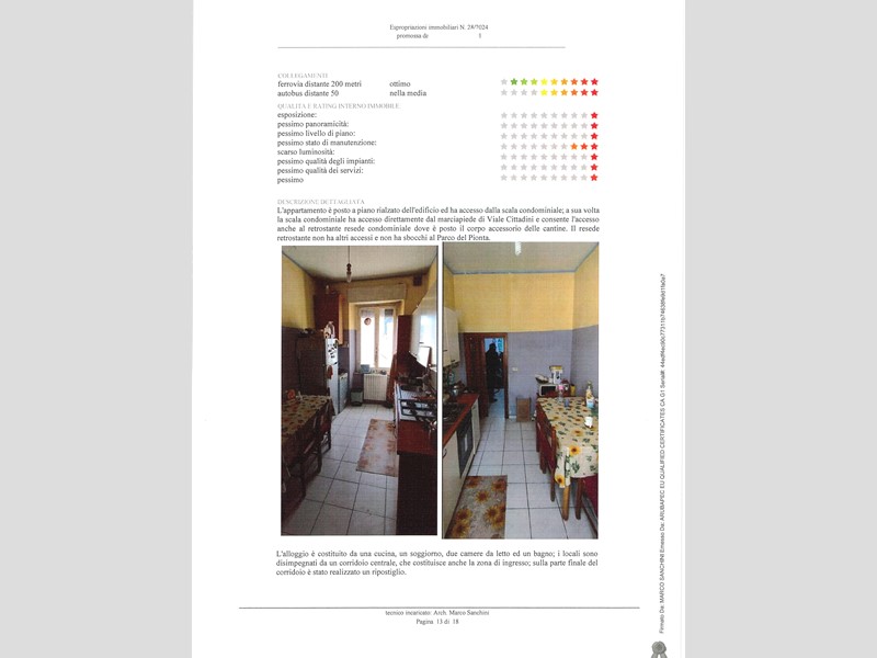 Diritto di piena proprietà per l’intero (1/1) su unità immobiliare costituita da appartamento posto al piano rialzato di un edificio di maggior consistenza sito in Arezzo, Viale Cittadini n. 17, composto da una cucina, un soggiorno, due camere da letto e un bagno, disimpegno centrale e ripostiglio. L’appartamento è corredato di cantina posta nel resede retrostante l’immobile principale.