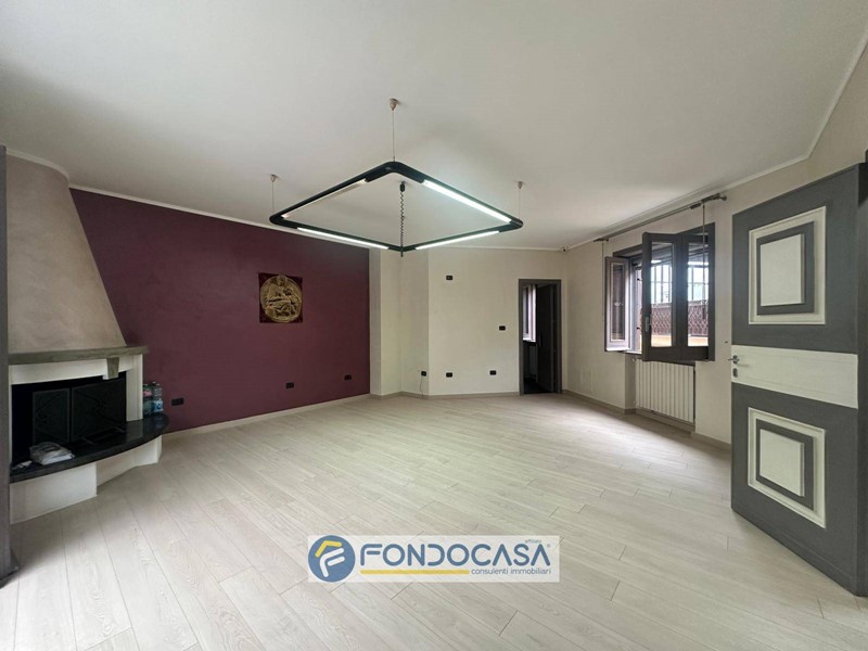 Luminosa zona giorno open space con camino, bagno e balcone affacciato su Via Vittorio Emanuele; finestre su Via Fratelli Cervi garantiscono ulteriore luce naturale.