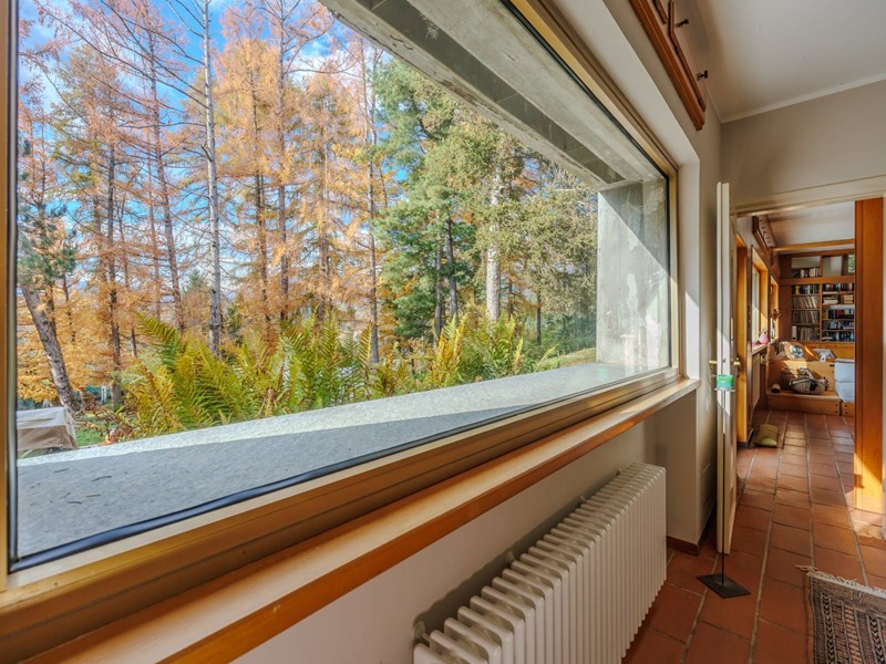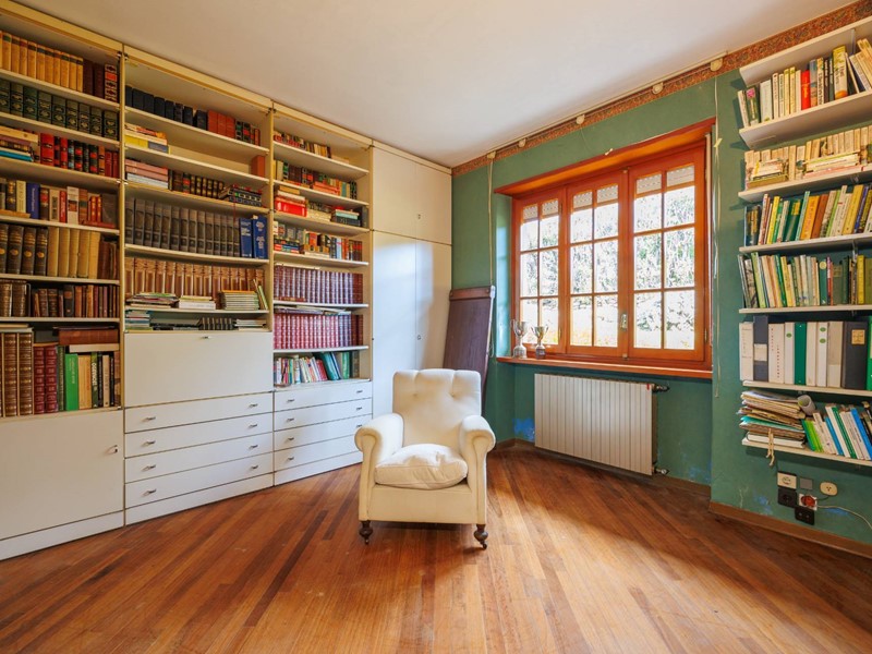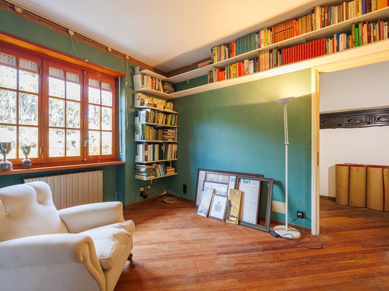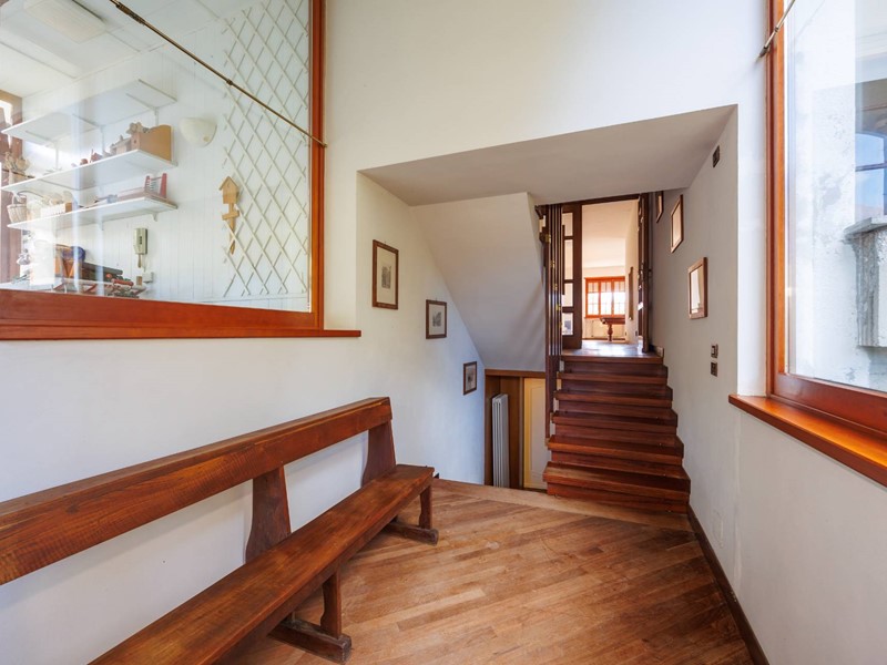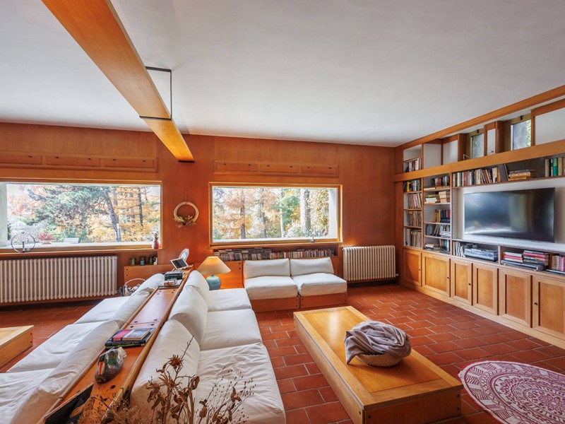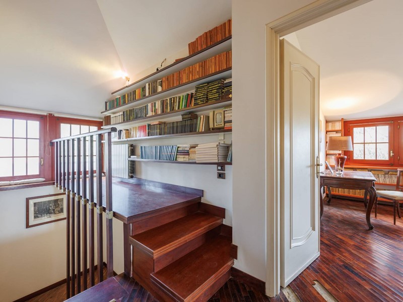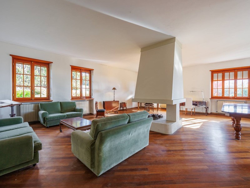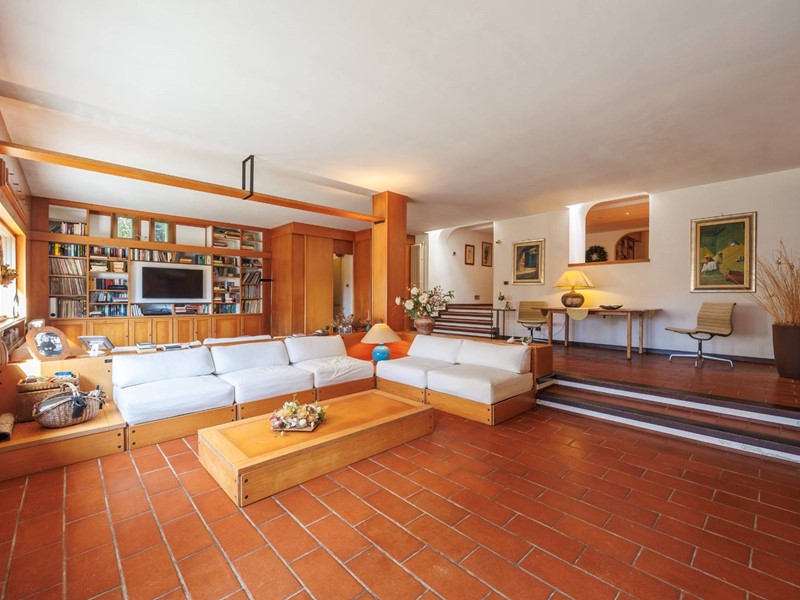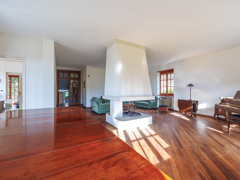 Al secondo livello l'ingresso principale ci conduce in un ampio salone con tripla esposizione e camino centrale, un tinello con camino, cucina, office, studio/biblioteca e bagno di servizio. Dal salone e dalla cucina si accede a un patio coperto, con vista sul prato pianeggiante e sul verde circostante.