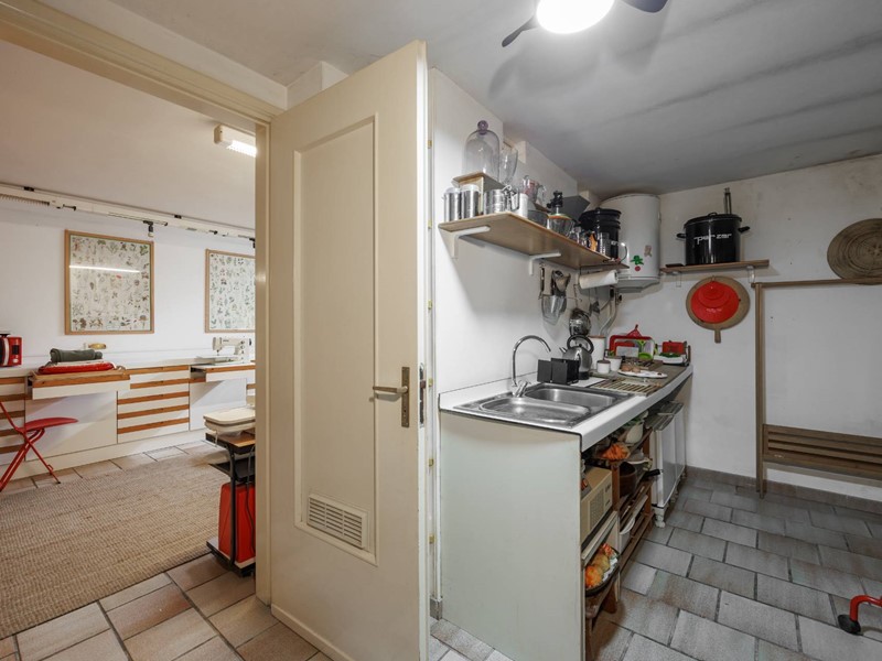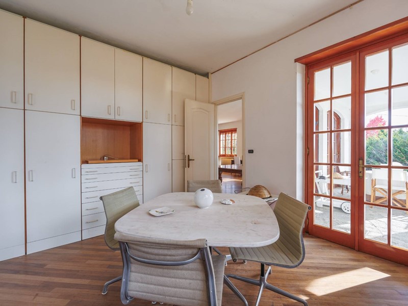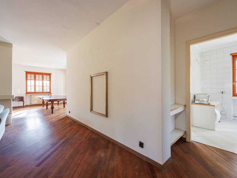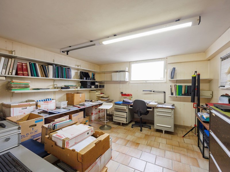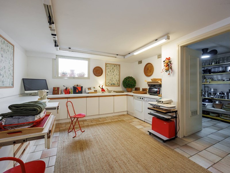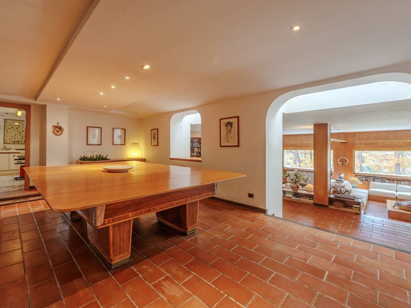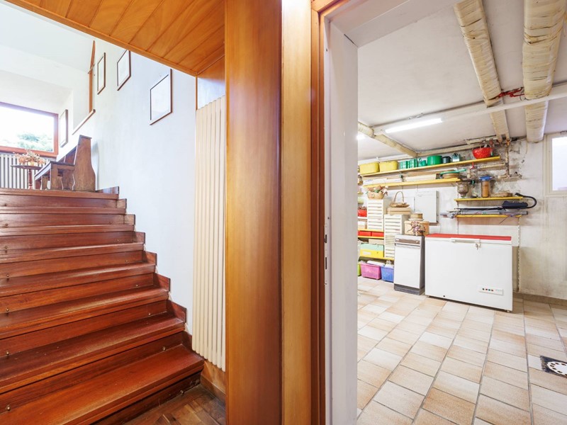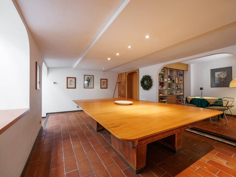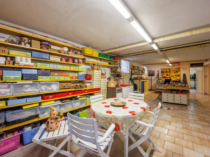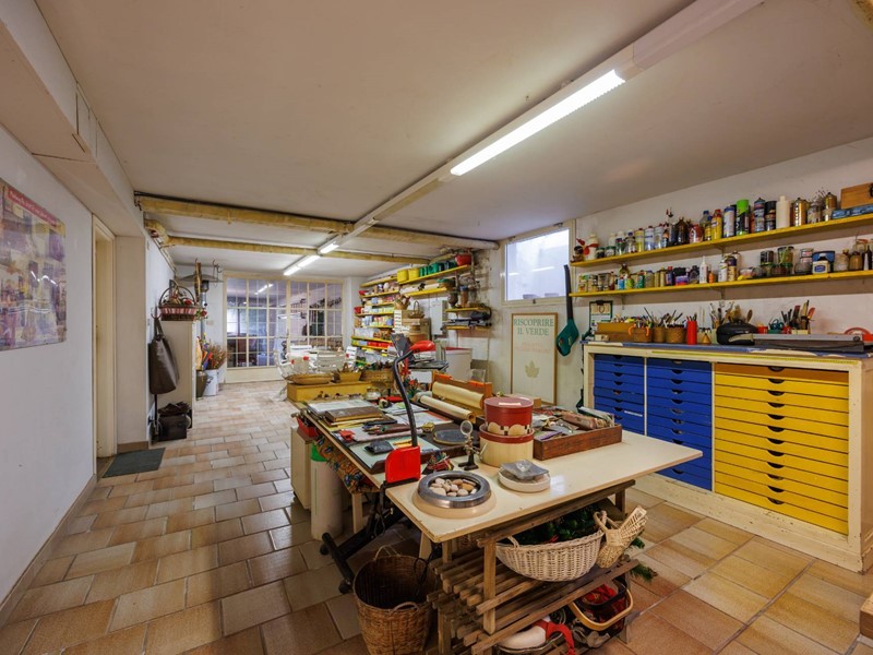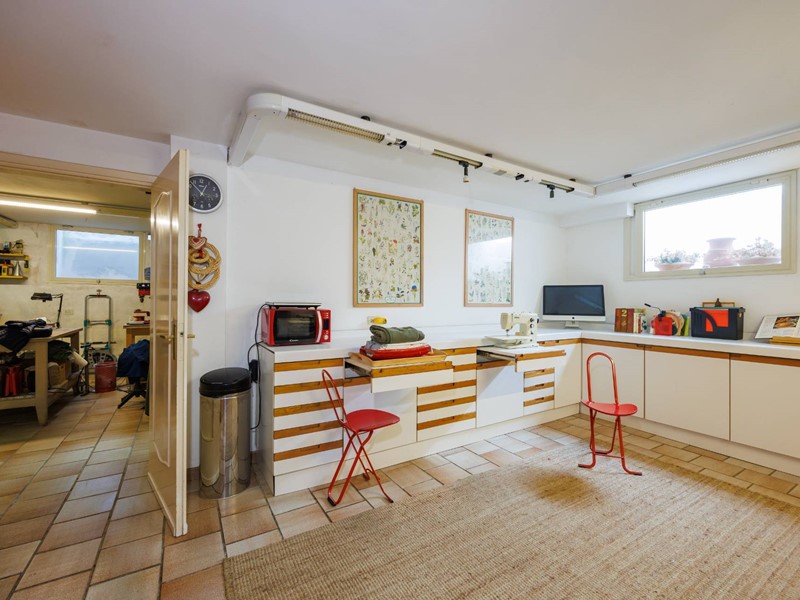Pochi gradini conducono alla sala biliardo, collegata a dispensa e laboratorio, in prossimità di cantina, officina e garage di generose dimensioni. Allesterno, prima dellingresso, è stato realizzato un delizioso angolo solarium terrazzato.