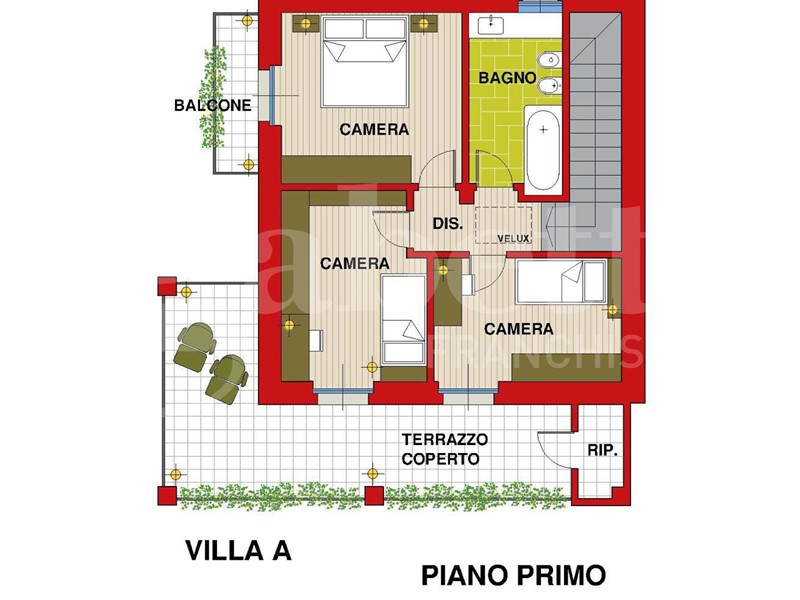Una scala interna in muratura conduce al piano superiore: tre camere ben distribuite, un disimpegno che respira, e una stanza con accesso esclusivo al terrazzo coperto, perfetto per chi desidera uno spazio tutto suo, al riparo, lontano dal rumore.