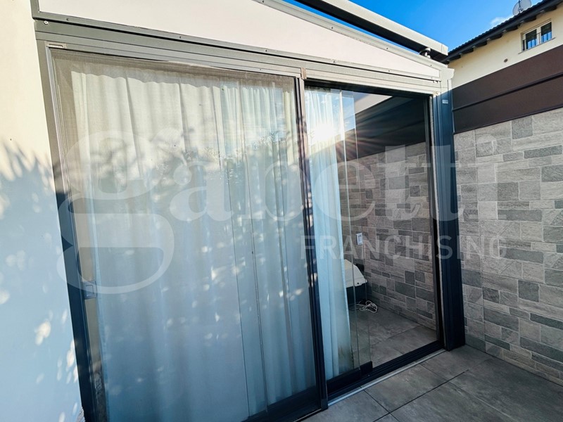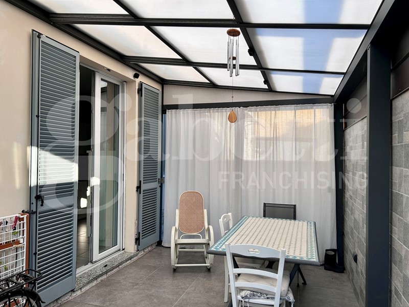 La veranda con tenda da sole motorizzata offre un'area ideale per pranzi all'aperto e momenti di relax.