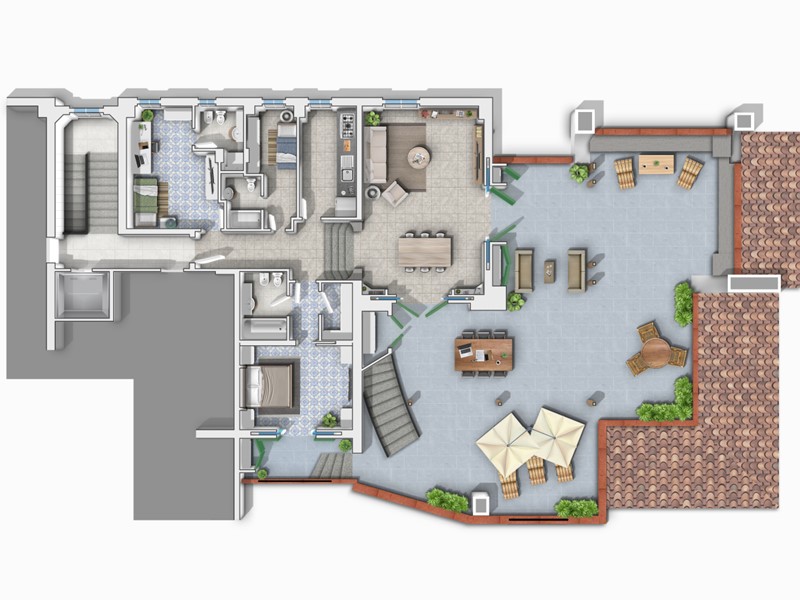 Il vero valore aggiunto della proprietà è rappresentato dalle ampie terrazze, disposte su due livelli, che regalano un raro senso di apertura e libertà. Gli spazi esterni includono aree perfette per pranzi all’aperto, zone relax e angoli panoramici, oltre a ripostiglio e spogliatoio, ideali per organizzare al meglio la vita estiva.