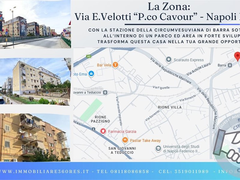 Open House esclusivo in Via Egidio Velotti-Parco Cavour - Appartamento da ristrutturare con cantina, ideale per chi desidera personalizzare gli spazi secondo il proprio gusto- Napoli - Via Egidio Velotti | Visita solo su prenotazione: Sabato 17 Gennaio 2026, dalle Ore 14:30 alle ore 15:30\nAll'interno del Parco Cavour, proponiamo in vendita un appartamento posto al 3° piano, completo di cantina di pertinenza.\n\n and #10024; Caratteristiche principali:\n - Superficie: appartamento da ristrutturare, ideale per chi desidera personalizzare gli spazi secondo il proprio gusto.\n - Cantina inclusa: perfetta per deposito e organizzazione.\n - Posizione: all'interno di un parco residenziale tranquillo e riservato.\n\n and #127795; Vantaggi del Parco Cavour:\n - Ampi spazi verdi per passeggiate e relax.\n - Possibilità di parcheggio interno.\n - Vicinanza strategica alla Circumvesuviana di Barra, che garantisce collegamenti rapidi e comodi con Napoli, Sarno e Poggiomarino.\n and #128204; Opportunità:\nQuesta soluzione rappresenta un'ottima occasione per chi cerca un immobile da ristrutturare e valorizzare, con tutti i comfort di un contesto residenziale ben servito e ben collegato.\n\nVisita l'immobile solo su invito\nPartecipa al nostro evento esclusivo Open House sabato 17 Gennaio 2026, dalle ore 14:30 alle 15:30. L'accesso è riservato e su prenotazione. Registrati subito per non perdere l'occasione di visitare questa splendida soluzione abitativa.\nPosti limitati. Prenota ora la tua visita con 360RES Immobiliare.\nContattaci subito per ricevere il link di registrazione all'Open House e ottenere in anteprima la scheda completa con foto, planimetria e dettagli!\nChi partecipa all'Open House riceverà in omaggio un'esclusiva guida su Come Vendere Casa a Napoli in sole 360 Ore al Suo Massimo Valore!\n\nAPE: Classe G, IPE 175,00\n\nVuoi Candidare anche la Tua Casa da vendere al sistema 360RES e scoprire se può superare la selezione per essere la prossima Casa più appetibile di Napoli relativamente alla sua Zona e Tipologia?\n\nPuoi semplicemente contattarci da qui oppure iniziare compilando l' utile e dettagliato form su https://bit.ly/valutazione_on_Line\n\nVendi | Compra | Progetta | Ristruttura | Abita con\n\n360RES - il punto di riferimento per Ogni esigenza immobiliare\nTel: 08118086858\nCel: 3519011989\nmail: info@360res.it\nwww.360res.it\nwww.immobiliare360res.it\n\nL'appartamento sarà visibile esclusivamente con la Formula #openhouse #360RES fissato per il Giorno Sabato 17/01/2026 dalle h: 14:30 alle 15:30\nmaggiori dettagli ed informazioni attraverso il nostro canale Youtube @360res e le nostre pagine Social che vi invitiamo a seguire per restare aggiornati cercandoci con l'Hashtag #360RES\n\n[Importante]: Essendo questa l'Unica Data in cui sarà possibile visionare l'immobile Vi suggeriamo di venire fin da subito accompagnati da tutte le persone che potranno supportarVi nell'eventuale decisione di acquisto, siano essi parenti, familiari, amici, tecnici o consulenti.\n\nLe informazioni riportate cosi come le immagini sono puramente indicative e non costituiscono elemento contrattuale - Maggiori Dettagli: Caldaia, Cantina, Balconi, Portiere, Cancello elettrico, Posto auto, Citofono