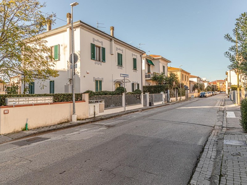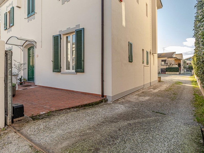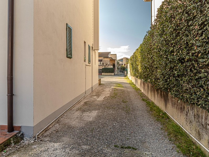 Accedi alla palazzina da un vialetto carrabile fronte strada e, passando sul retro, raggiungi l'ingresso con uno spazio frontale perfetto per