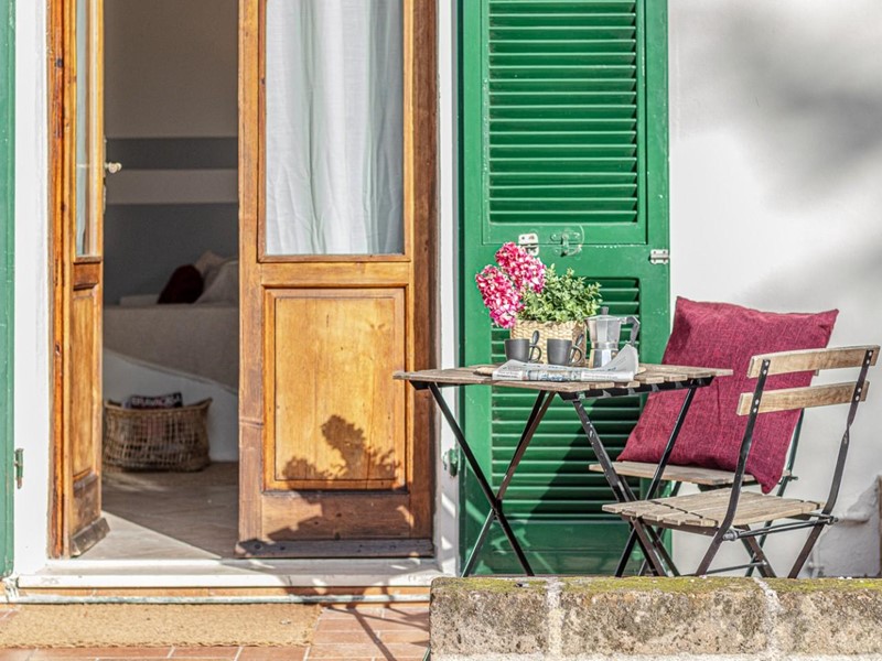 Gli infissi originali in legno, le porte rinnovate, le pareti appena ritinteggiate con colori contemporanei e il pavimento in gres creano un