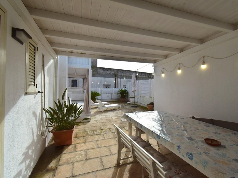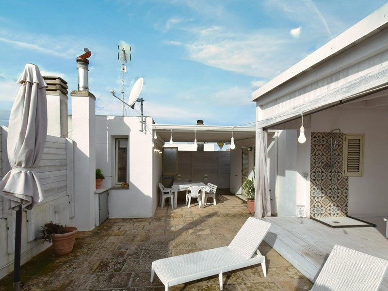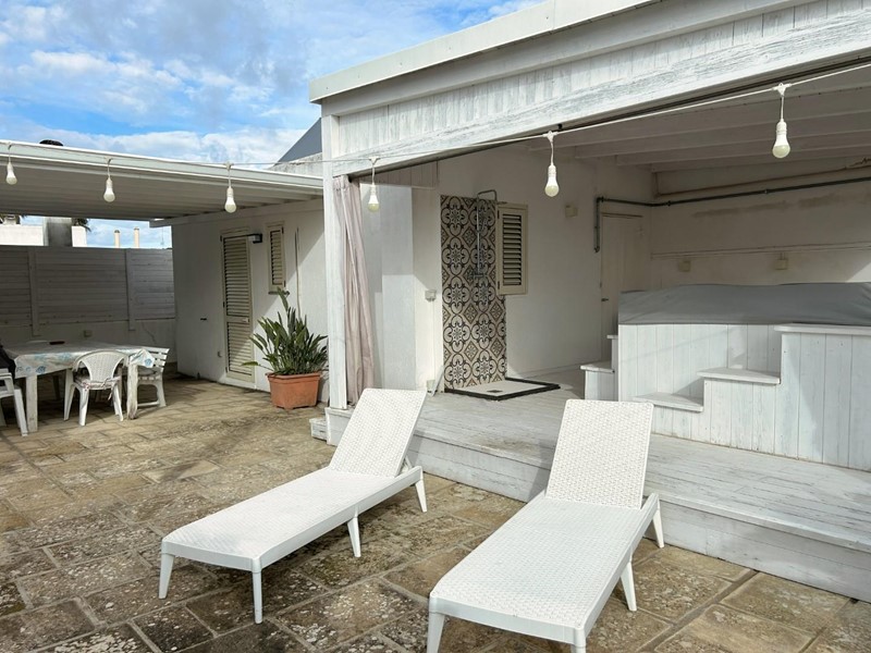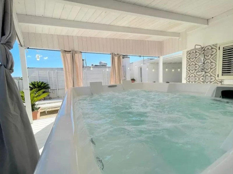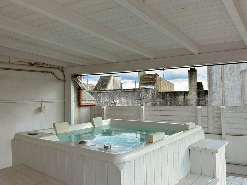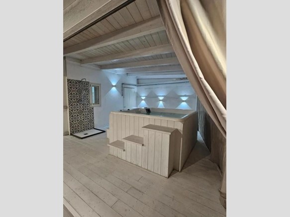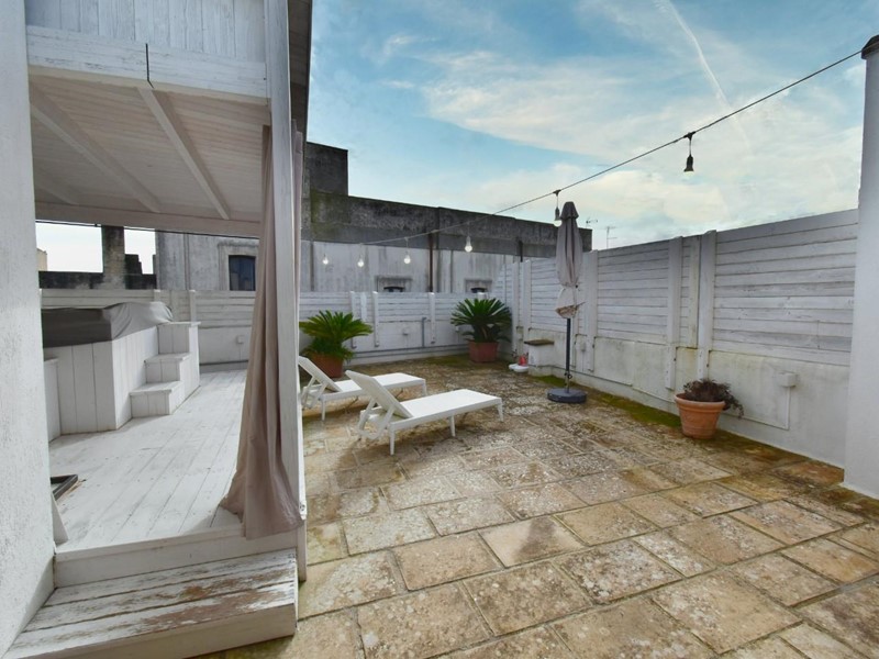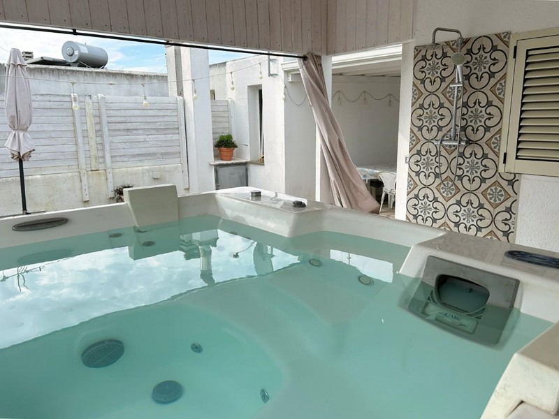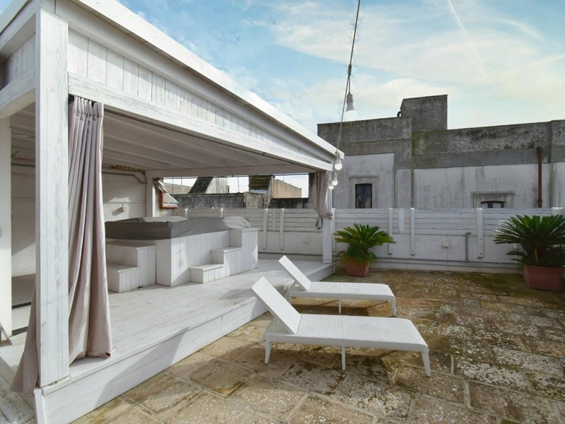 Una scala esterna conduce al livello superiore, un vero valore aggiunto per una casa nel centro abitato. Qui si apre un grande terrazzo attrezzato, uno spazio all'aperto riservato, ideale per rilassarsi, cenare sotto le stelle o godersi il cielo del Salento. A completare questo ambiente esclusivo, una piscina/jacuzzi privata offre un’oasi di benessere lontano da sguardi esterni.