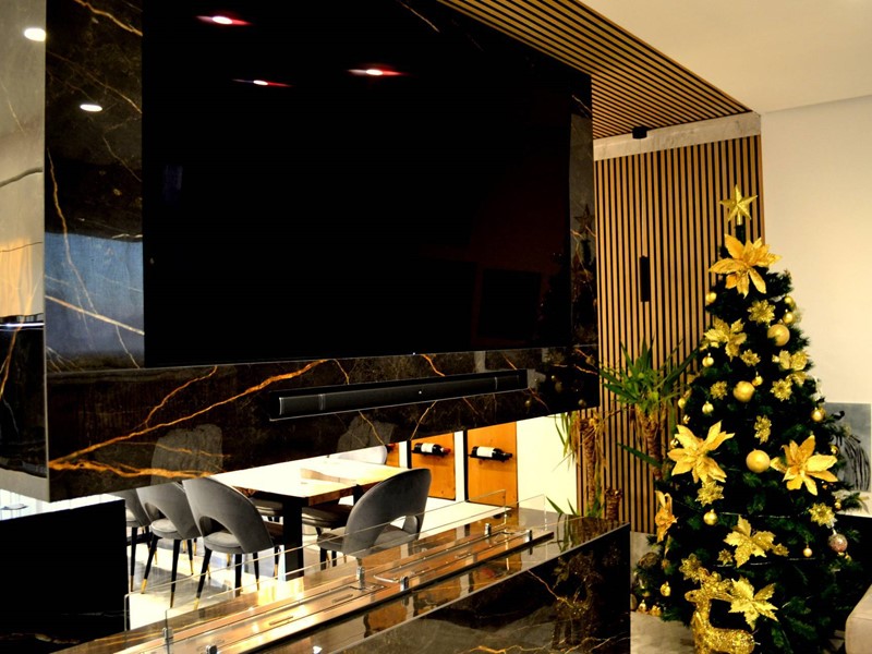 Per massimizzare l'atmosfera, ogni settore del terrazzo vanta un proprio camino in bioetanolo e televisore.