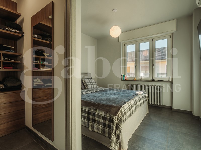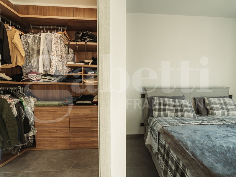 La camera matrimoniale sembra disegnata su misura: la cabina armadi attrezzata è una soluzione che semplifica la quotidianità, libera spazio, dà ordine e comfort visivo.