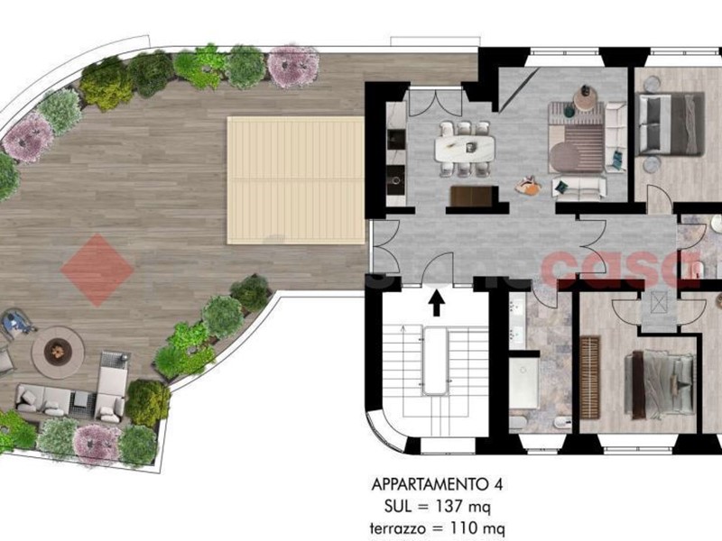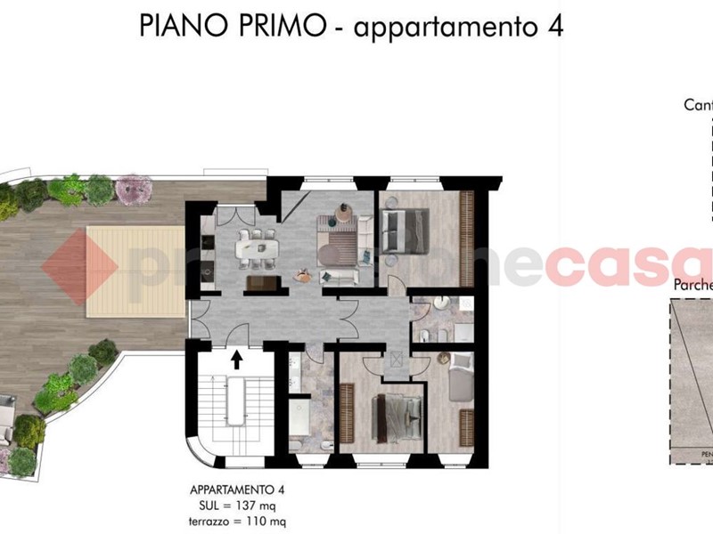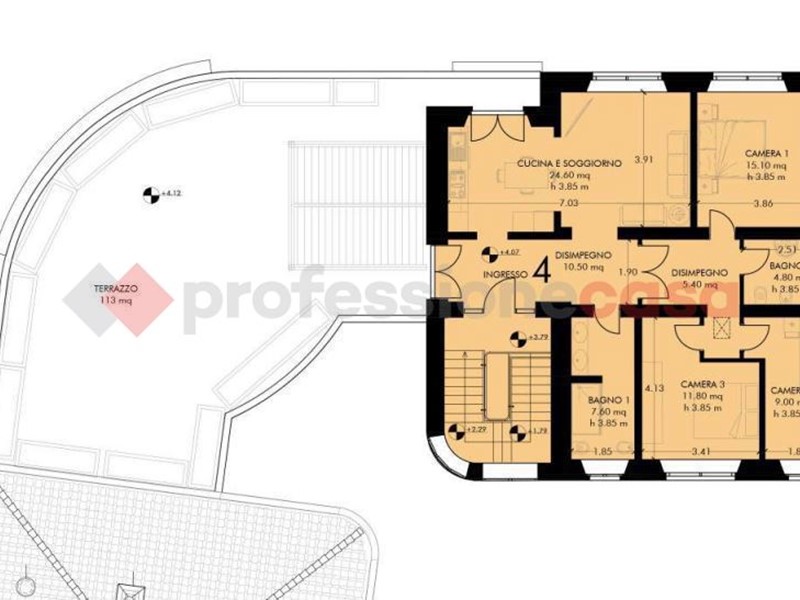 L'appartamento n.4 è un quadrilocale di 137 mq circa, con 3 camere da letto, una impagabile terrazza di 113mq circa in pieno centro storico, cantina e posto auto.
