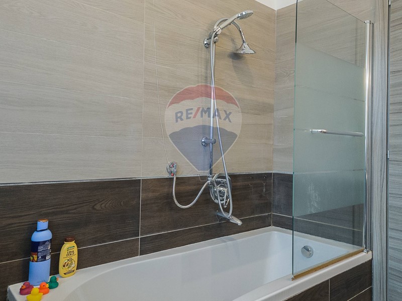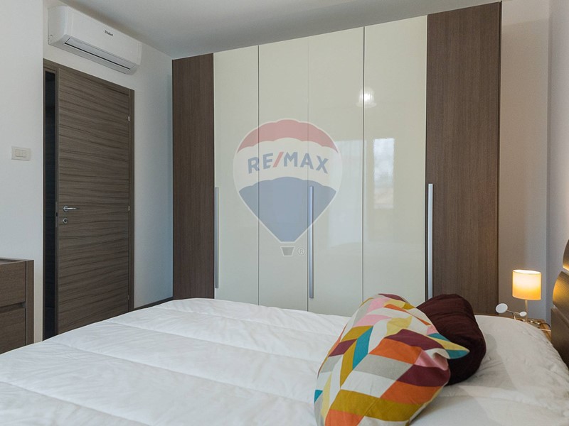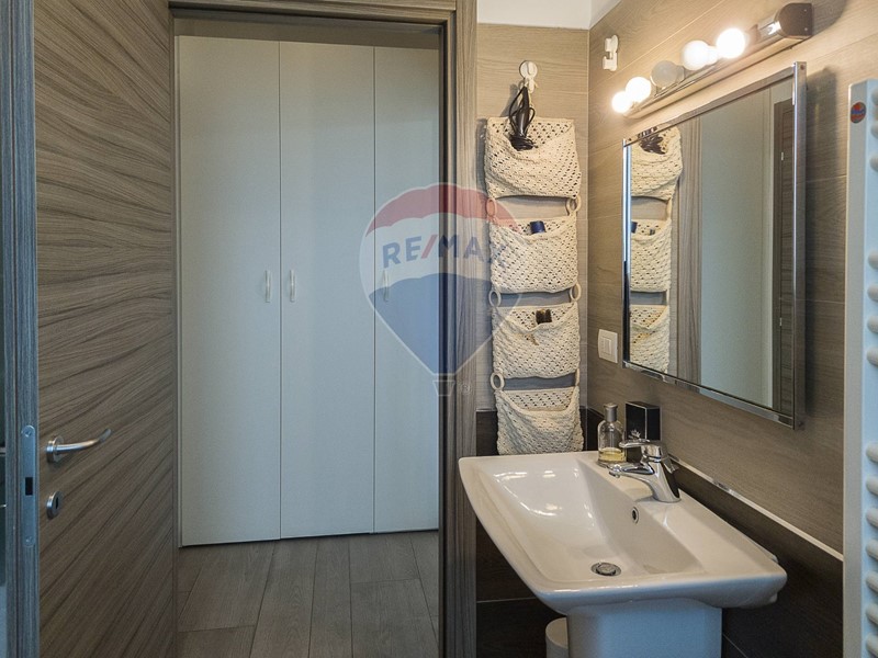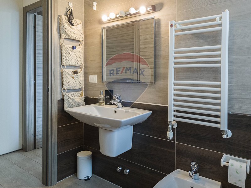 La zona notte comprende una spaziosa camera da letto e un bagno finestrato con doccia, rifinito con sanitari di design e un mobile lavabo elegante.