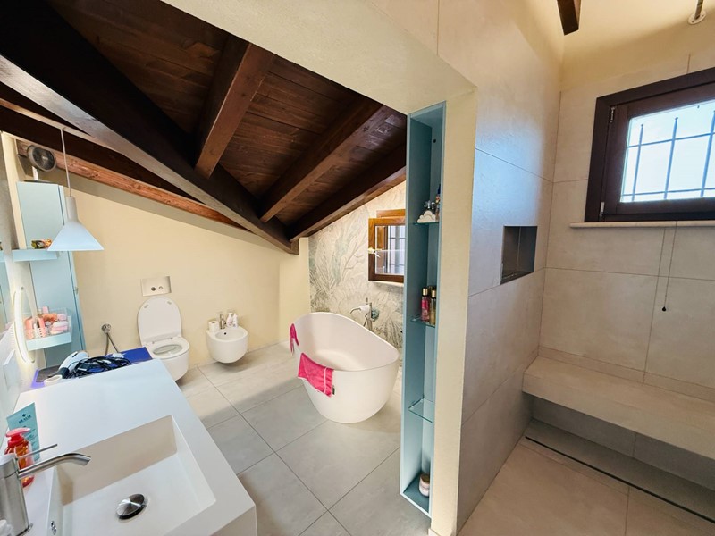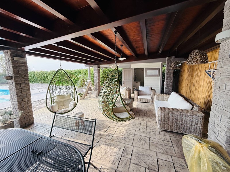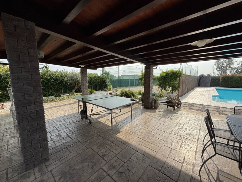 Completano la proprietà il doppio Garage, il Giardino sui 4 lati, il Pergolato di 90 mq. che affaccia sulla Piscina ed il campo da Beach Tennis.