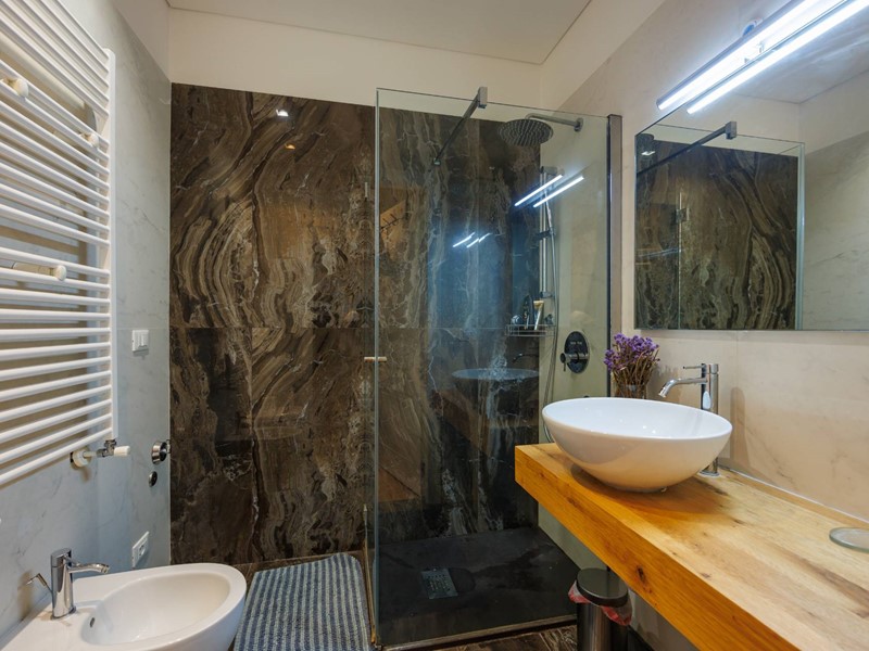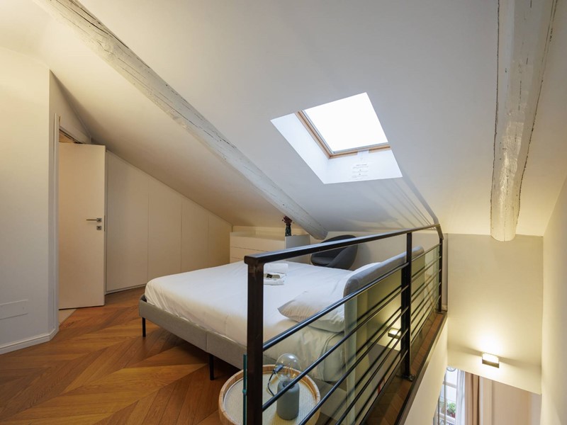 Una scala interna conduce ad altra zona indipendente al piano superiore, con bagno privato, adatta a seconda camera oppure studio.