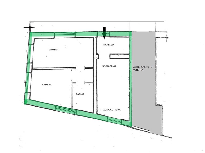 Zona LA PIANTA in piccolo condominio appartamento posto al piano terra con ingresso indipendente di TRE vani, composto da ampio ingresso, soggiorno con zona cottura, disimpegno per servizio igienico e due camere da letto.