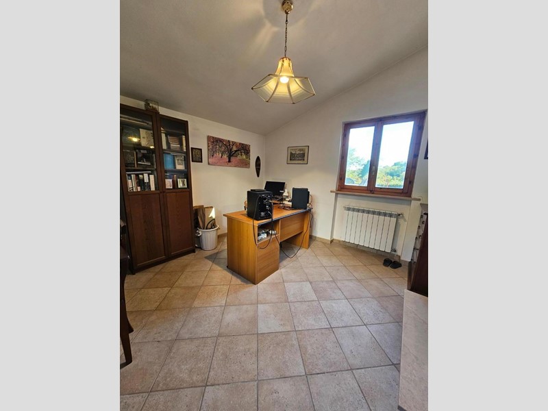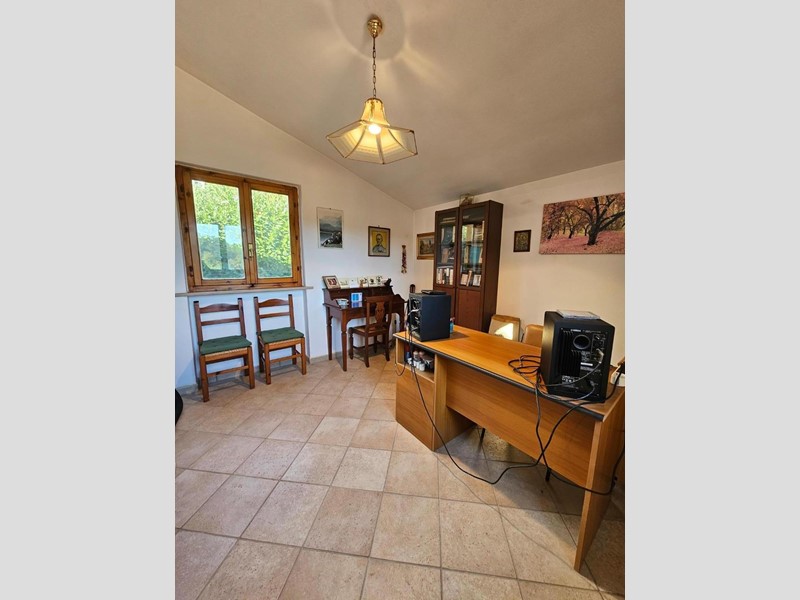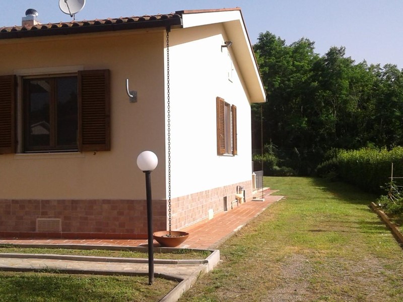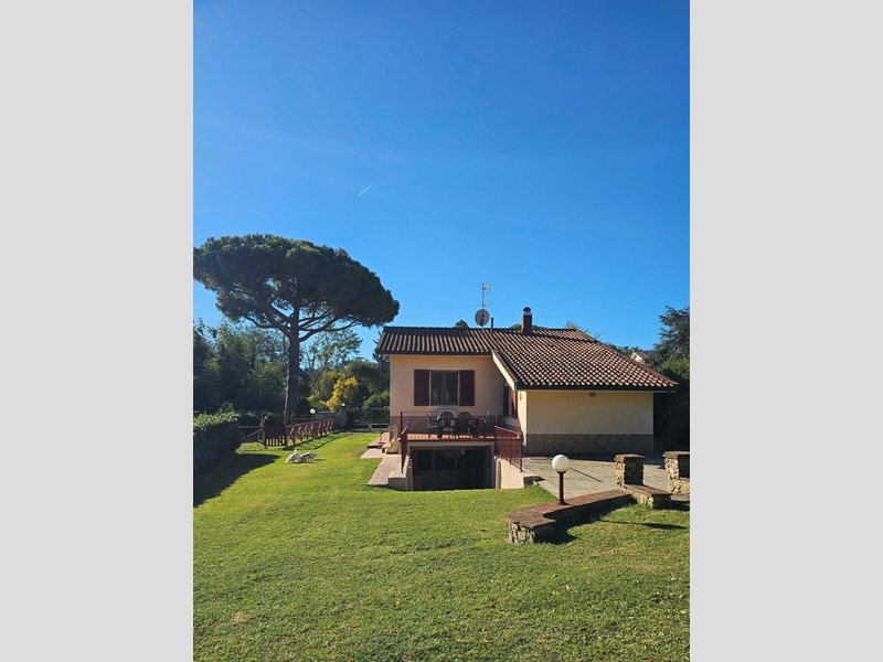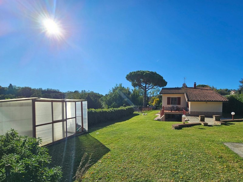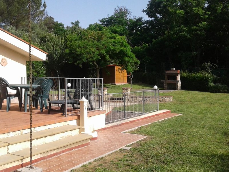 In bellissimo contesto riservato ma non isolato, immersa nel verde e in posizione panoramica, villetta indipendente in ottime condizioni, disposta interamente al piano terra rialzato e composta da ingresso da portico, soggiorno con camino a doppia apertura sulla cucina abitabile, ripostiglio, studio, due camere matrimoniali, bagno e terrazza abitabile di circa 20 metri. La proprieta' e' corredata da ampio giardino di circa mille metri con alberi da frutto, barbecue e annesso di legno. Garage di circa 21 metri.