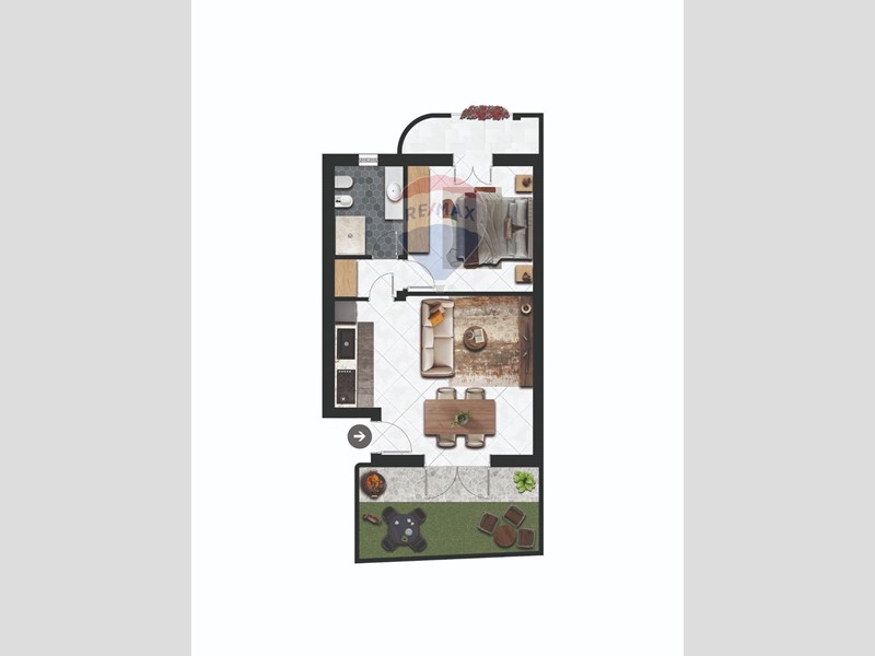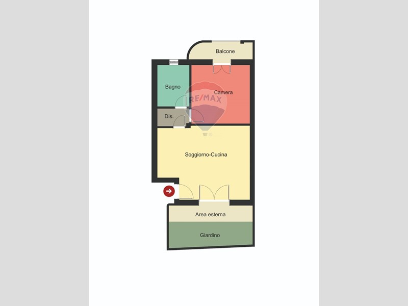L'appartamento è così composto: ingresso sul soggiorno con cucina a vista, area esterna/giardinetto, disimpegno, bagno, camera matrimoniale con balcone.