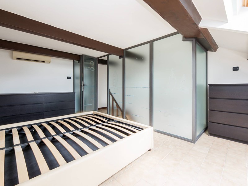 Dal lato opposto la camera da letto matrimoniale e al centro della sala la bellissima scala in legno, molto comoda con ampi scalini che conduce al piano superiore in cui troviamo la seconda camera da letto, un bagno in camera e un disimpegno molto caratteristico che può essere utilizzato ad esempio come cabina armadi.