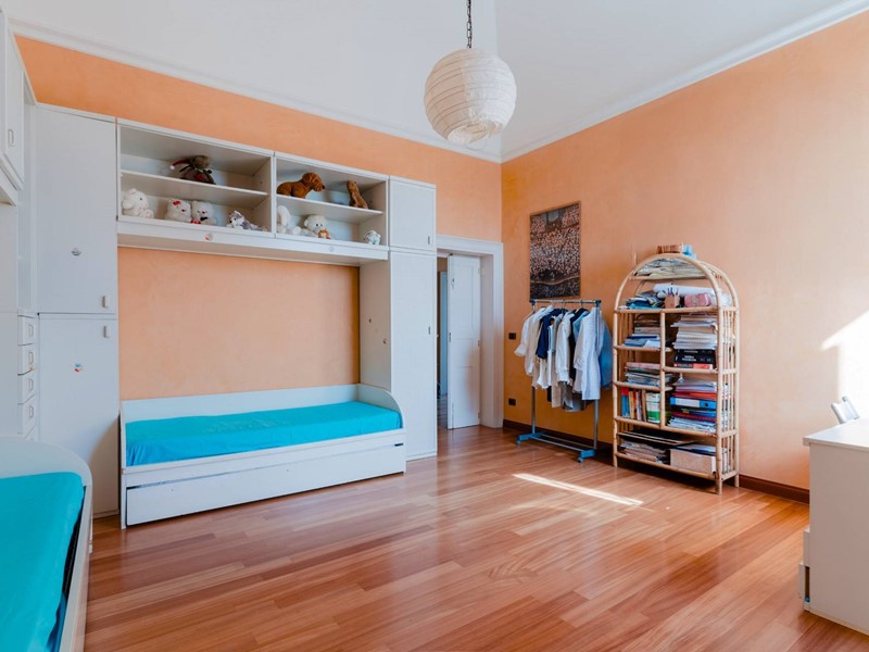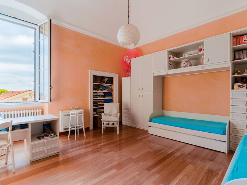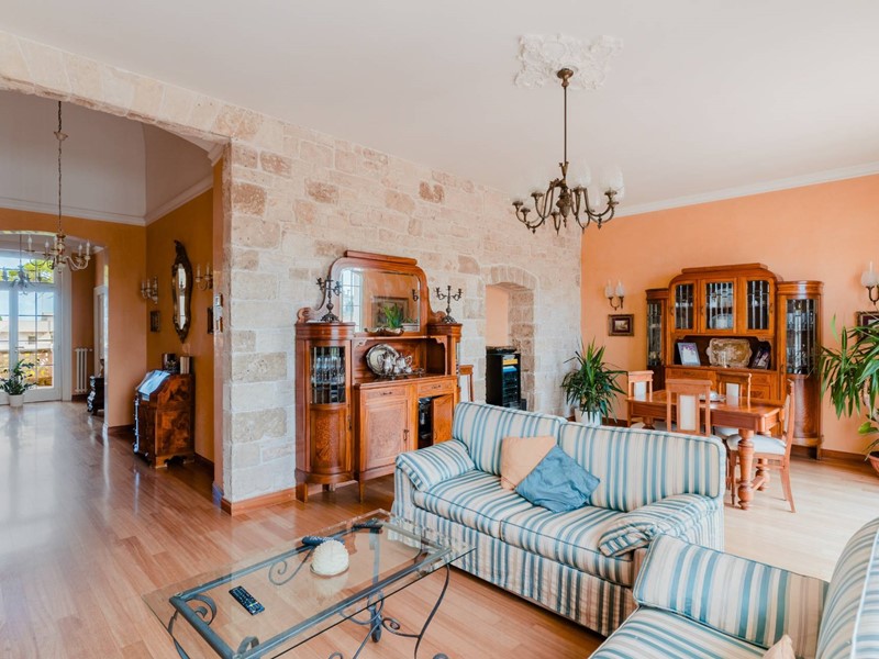 Un ingresso laterale ci conduce appunto al primo piano, attraverso una scala in pietra con ringhiera in ferro battuto e mancorrenti in legno, mentre saliamo incontriamo una statua raffigurante una donna oggetto di ritrovamento avvenuto durante la bonifica di un vecchio pozzo. Il pianerottolo ci introduce allappartamento tramite un doppio ingresso, uno di servizio ci porta in una cucina comoda ed abitabile le cui finestre dalle notevoli superfici vetrate rendono lambiente luminoso e ben arieggiato senza trascurare il termo camino e laffaccio su di un terrazzo al piano che si sviluppa su due livelli, proponendoci una gradevolissima vista sulla parte posteriore del parco e cioè su di un agrumeto e la modernissima piscina. Un esplicito invito al relax. Dallingresso principale si accede ad un grande e luminoso disimpegno, con a sinistra uno splendido salone angolare con ampie vetrate anchesso con uscita sul terrazzo e vista su parco e piscina. Sul lato speculare opposto abbiamo una bella libreria che maschera un comodo ripostiglio, una sala bagno con doccia e vasca idromassaggio, oltre tre camere matrimoniali.
