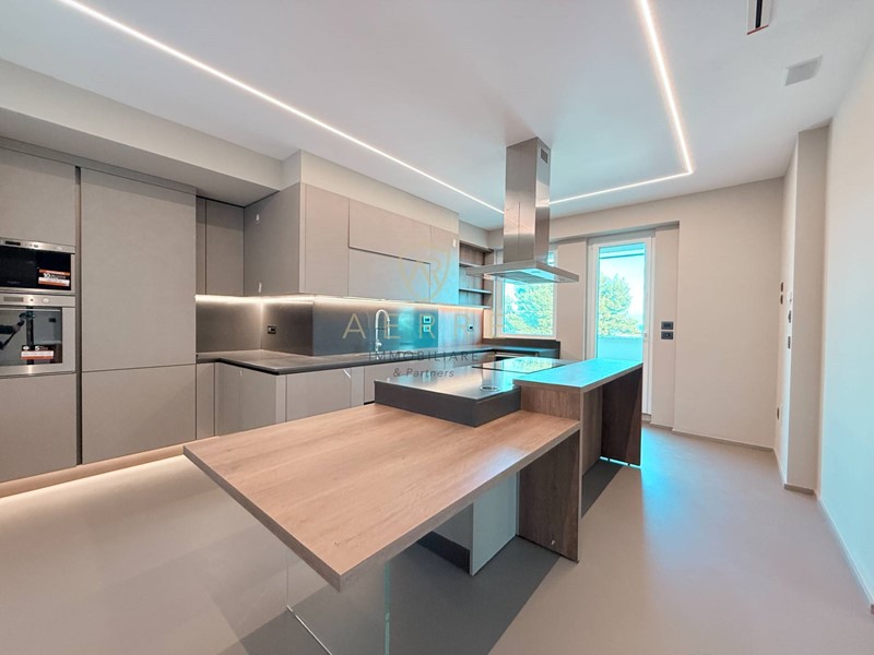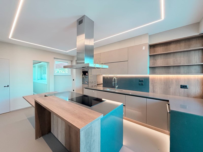 Il salone dialoga fluidamente con la cucina di design: elegante, moderna, completa di ogni optional, creata per essere vissuta con naturalezza, funzionalità e consapevolezza estetica.