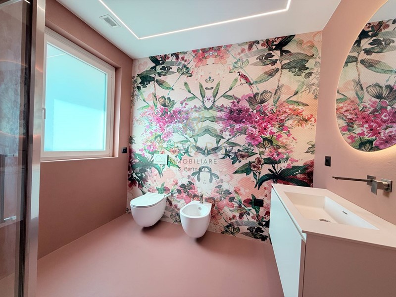 Raffinata, armoniosa, femminile senza eccessi: anchessa con bagno dedicato, impreziosito da una parete artistica e da una doccia scenografica.