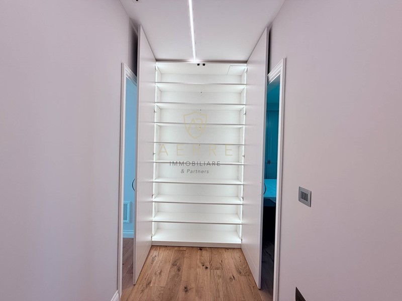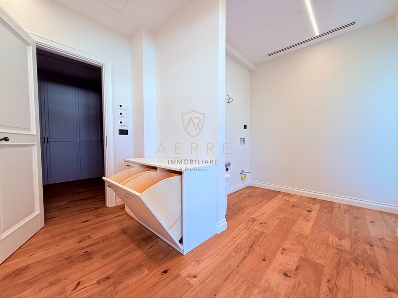 La lavanderia dedicata aggiunge praticità senza interferire con la purezza architettonica, mentre armadiature a muro e finiture sartoriali completano un percorso distributivo impeccabile.