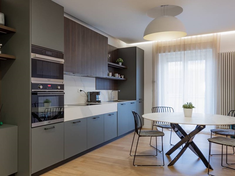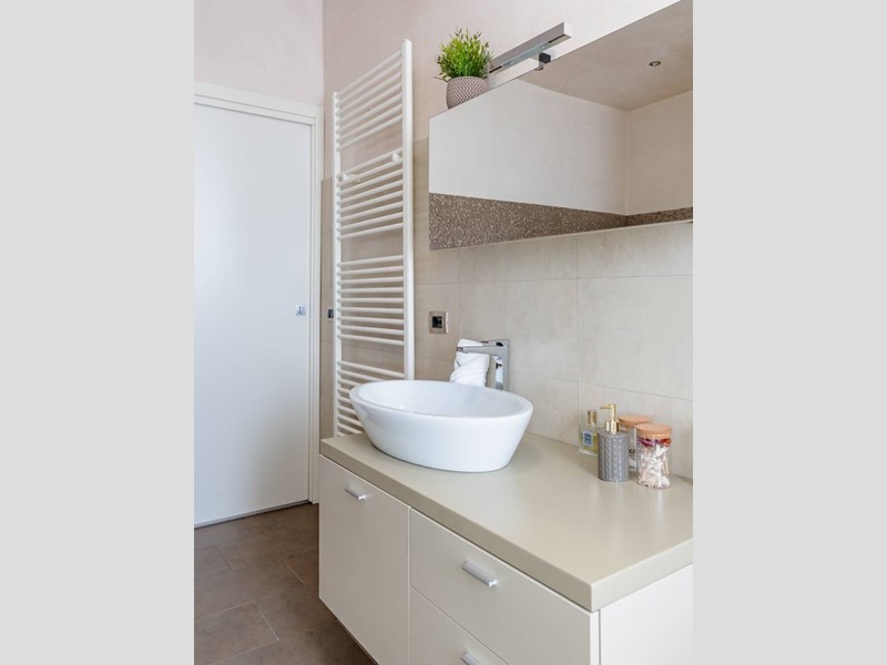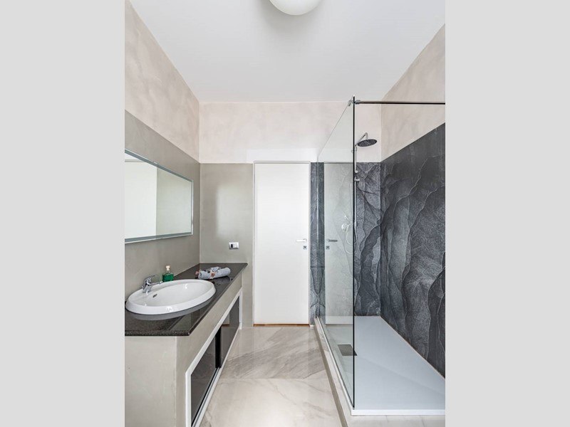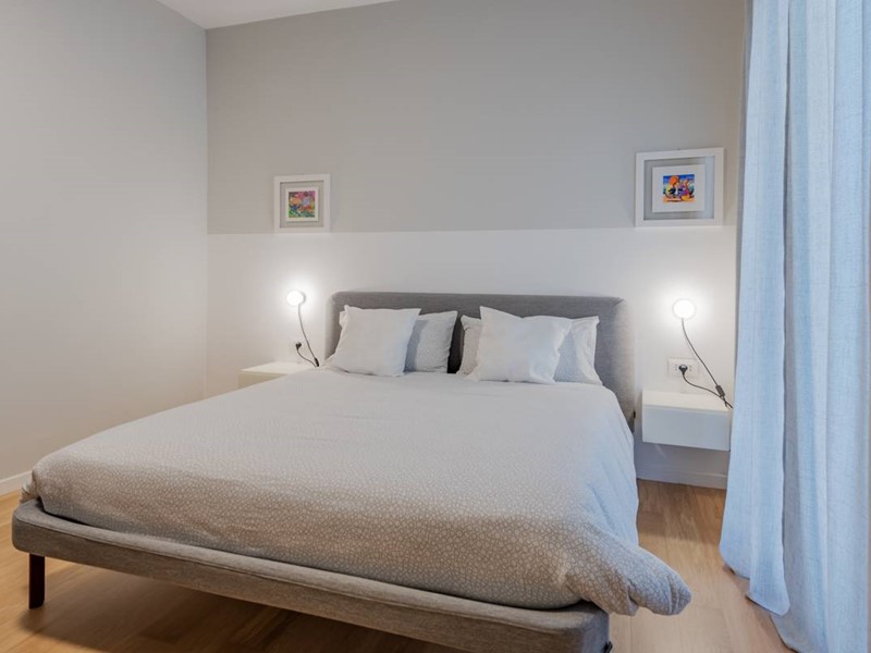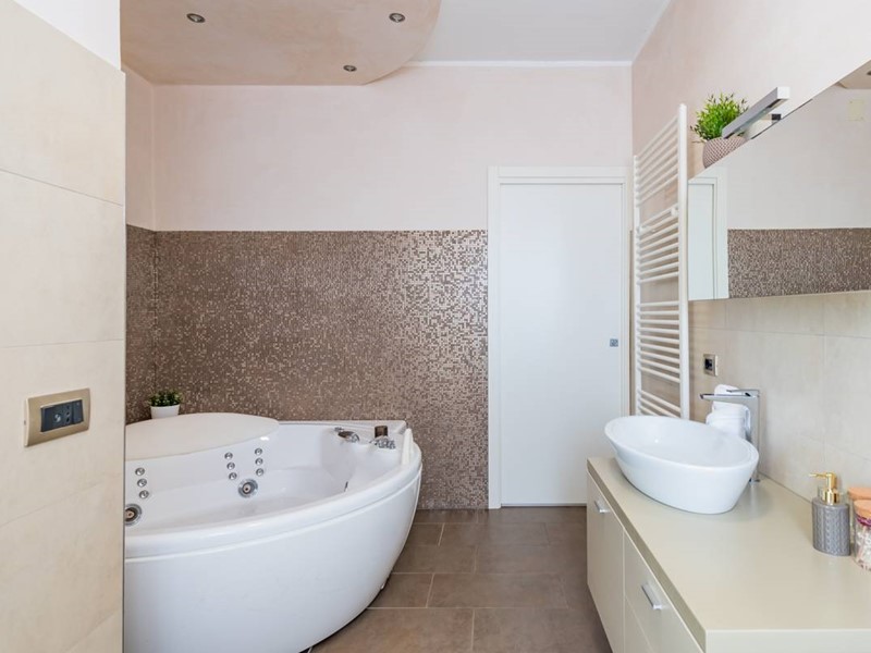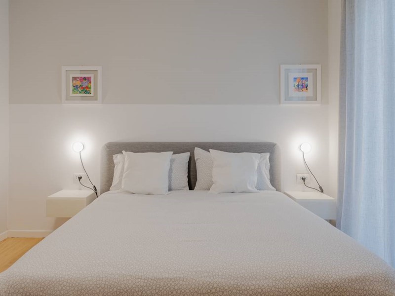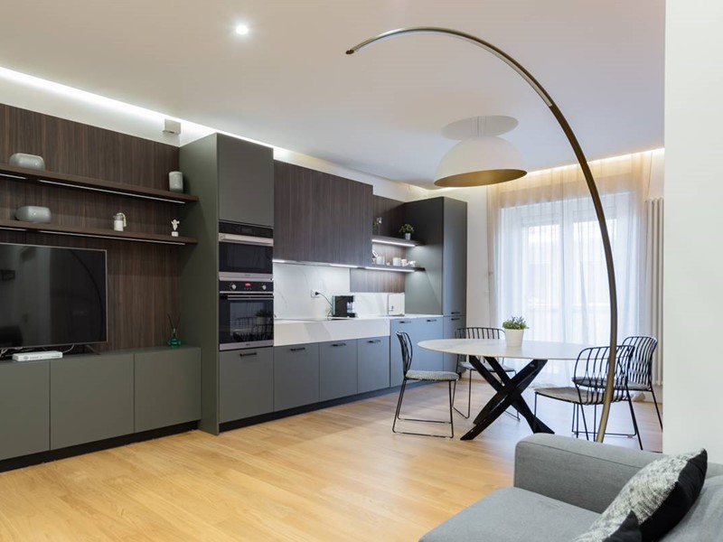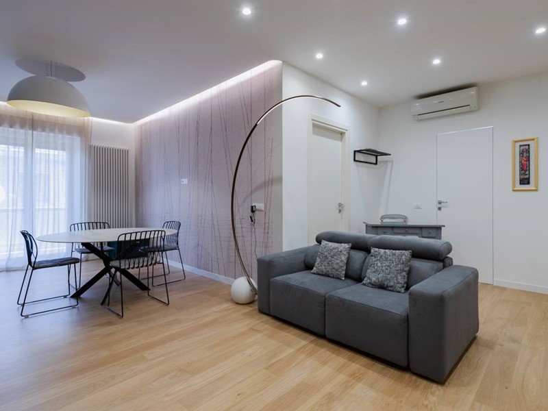 L'immobile è situato al piano primo di uno stabile familiare di sole 4 unità abitative. L'ingresso si apre su un ampio soggiorno arredato con gusto, dotato di zona living, zona pranzo e cucina a vista, completamente attrezzata con elettrodomestici moderni e finemente arredata con mobili di alta qualità.