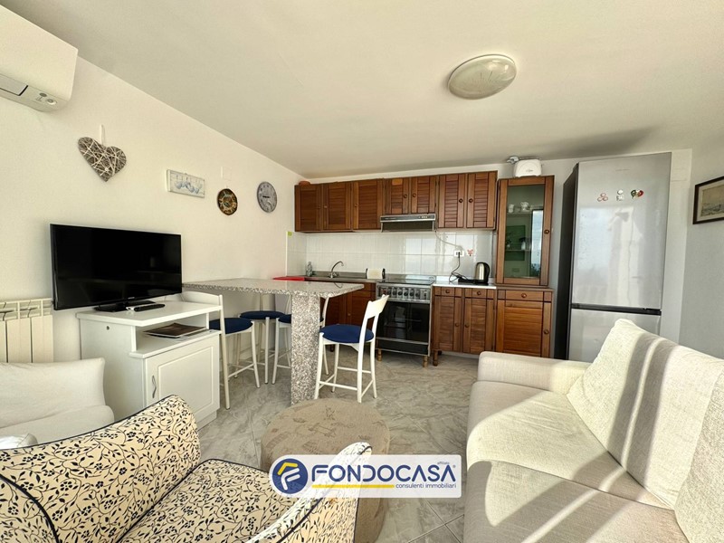 Al piano inferiore è presente un ampio bilocale composto da un soggiorno con cucina a vista, una camera da letto e un bagno finestrato. Esternamente è presente un terrazzo, ambiente ideale per pranzi all'aperto e momenti di relax con vista mare.