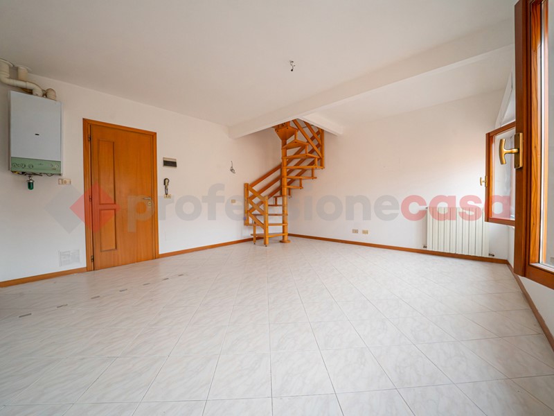 L'ingresso si apre su un'ampia zona giorno con angolo cottura e ripostiglio. Una scala a chiocciola conduce al piano superiore, dove si sviluppa la zona notte composta da un bagno finestrato con vasca, uno studio/cameretta, una camera e un'ulteriore camera matrimoniale con accesso alla terrazza di circa 16 mq.
