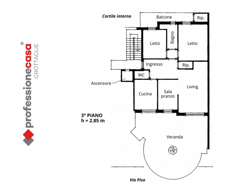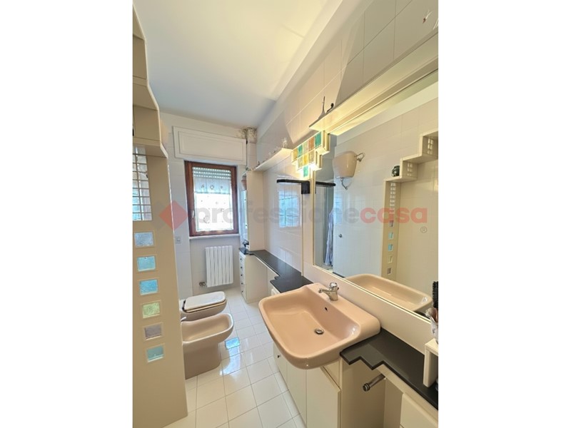 La superficie commerciale dell'immobile è pari a 135 mq, distribuiti in modo razionale. L'ingresso si apre su un disimpegno che conduce alla zona giorno, composta da un luminoso living comunicante con la sala da pranzo e da una comoda cucina abitabile, tutti ambienti che affacciano sull'ampia e caratteristica terrazza a livello circolare di circa 70 mq con vista su Via Pisa. La zona giorno è completata da un bagno di servizio e da un pratico ripostiglio.