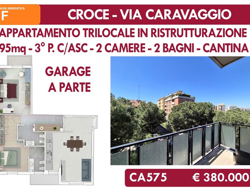 Casalecchio di Reno - Croce - Via Caravaggio: appartamento trilocale di 95mq posto al terzo piano con ascensore, in corso di totale ristrutturazione da parte di impresa specializzata. Ingresso su ampio soggiorno con cucina a vista e primo balcone, disimpegno notte arredabile con zona lavanderia, due camere da letto matrimoniali di cui una con bagno privato e l'altra con secondo balcone, ulteriore bagno, cantina. Autorimessa a parte a Euro 20.000. APE in fase di ricalcolo. Possibilità di personalizzazione di alcune finiture. Vendita esente IVA. Rif.CA575 Euro 380.000