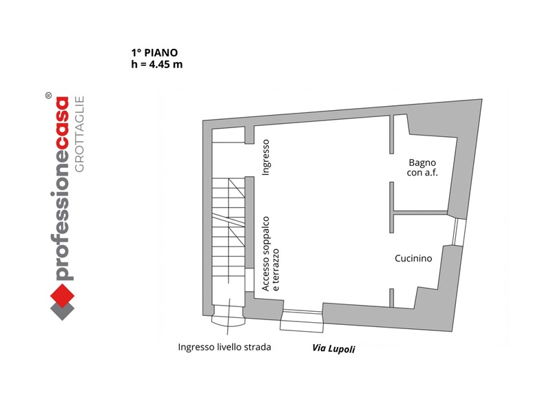 L'appartamento, con accesso da Via Lupoli, si sviluppa al primo piano con zona giorno completa di cucinotto, bagno e balconcino in affaccio su Via Lupoli.
