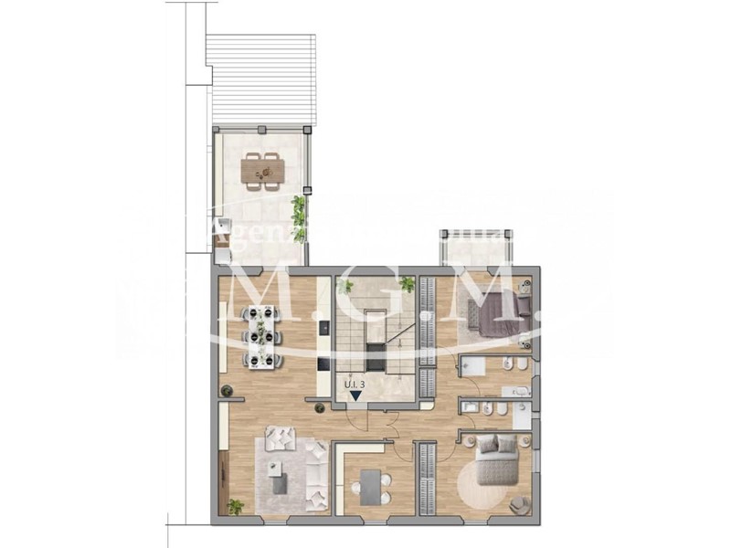 L'appartamento si apre su un ampio ingresso che conduce alla zona living, caratterizzata da un soggiorno spazioso e accogliente, ideale per rilassarsi o ricevere ospiti in un ambiente luminoso e confortevole.