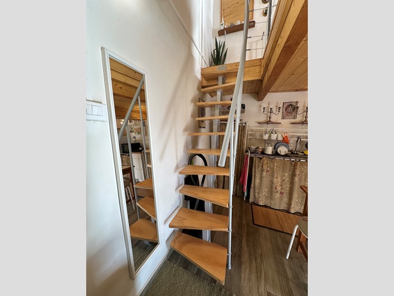 Il piano terra accoglie una luminosa zona living con angolo cottura, elegantemente organizzata, oltre ad antibagno e bagno.