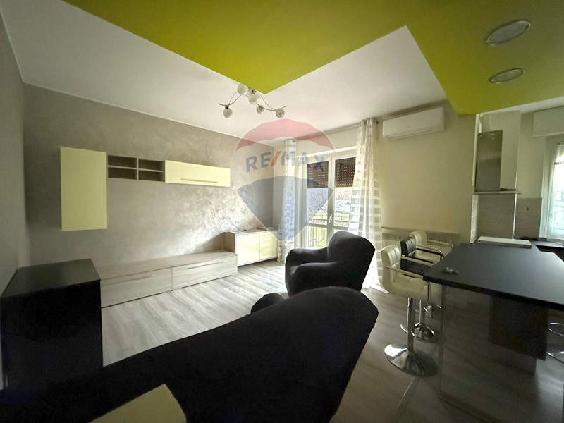 Attraverso il portoncino blindato si accede alla zona giorno composta da cucina a vista ed un comodo bancone di design.