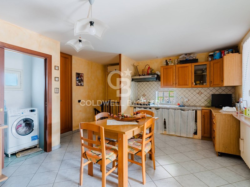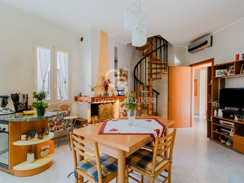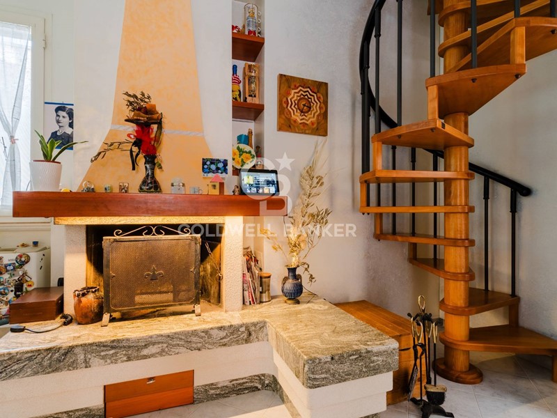 La zona giorno si apre con un ampio ingresso che conduce, da un lato, al soggiorno, luminoso e perfetto per i momenti di convivialità, e dallaltro al tinello-cucina, ambiente caldo e raccolto reso ancora più accogliente dalla presenza di un camino. Da qui parte una comoda scala in legno che collega direttamente alla mansarda e alla terrazza, garantendo un accesso pratico agli spazi superiori senza dover utilizzare le scale comuni.